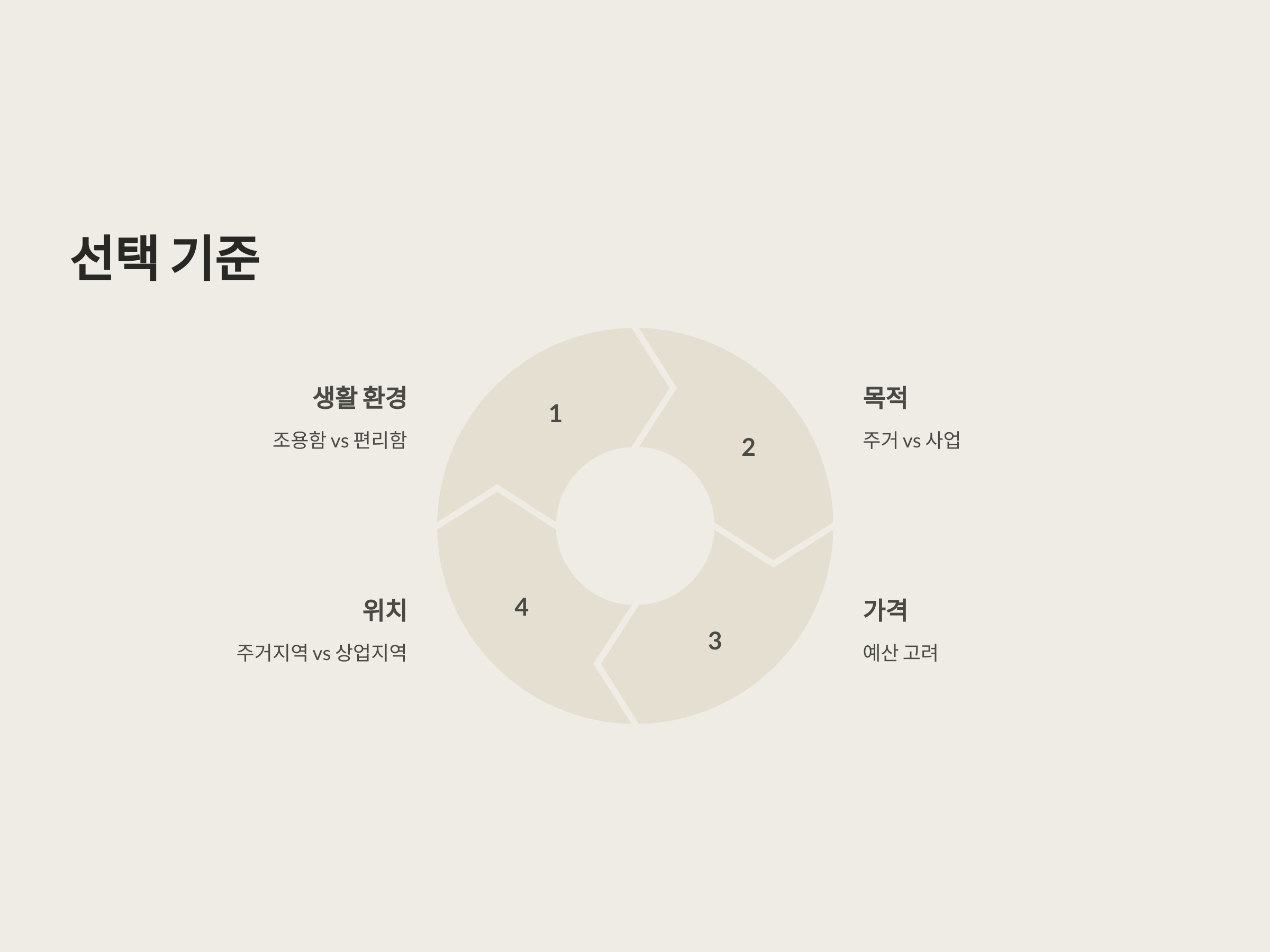 - 상업적인 편리함이나 근처에 상업시설이 많은 곳에 살고 싶다면 오피스텔을 고려해볼 수 있습니다. 오피스텔은 주거지와 상업시설이 결합된 형태이므로 교통이 편리하고, 사업과 주거의 병행이 가능합니다.