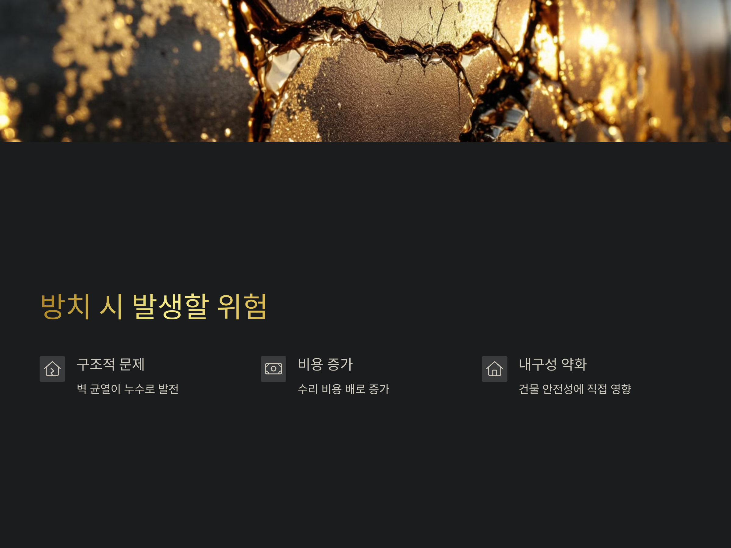벽면에 균열이 발생하면 구조적인 문제로 이어질 수 있습니다. 벽체의 균열은 외부의 압력이나 기후 변화로 인해 발생할 수 있으며, 심각한 경우 건물의 안정성을 위협할 수 있습니다.