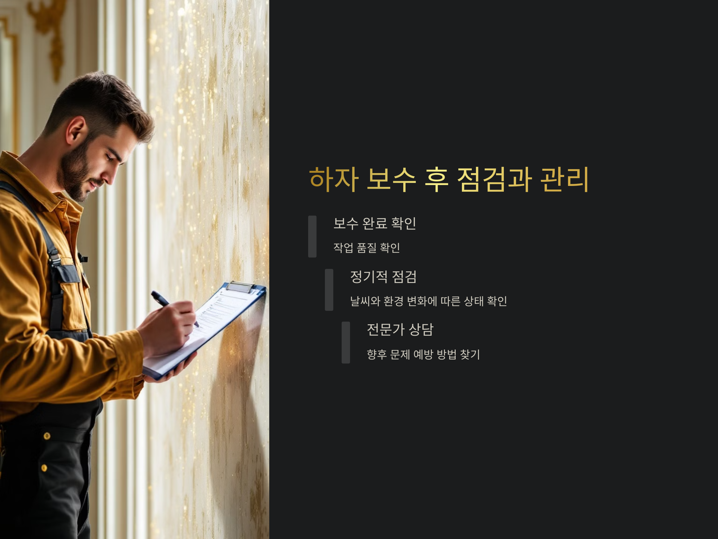 하자 보수가 완료된 후에도 지속적인 점검과 관리가 필요합니다. 보수 후 문제가 발생하지 않도록 주기적으로 건물을 점검하고, 보수 작업이 제대로 이루어졌는지 확인하는 것이 중요합니다.