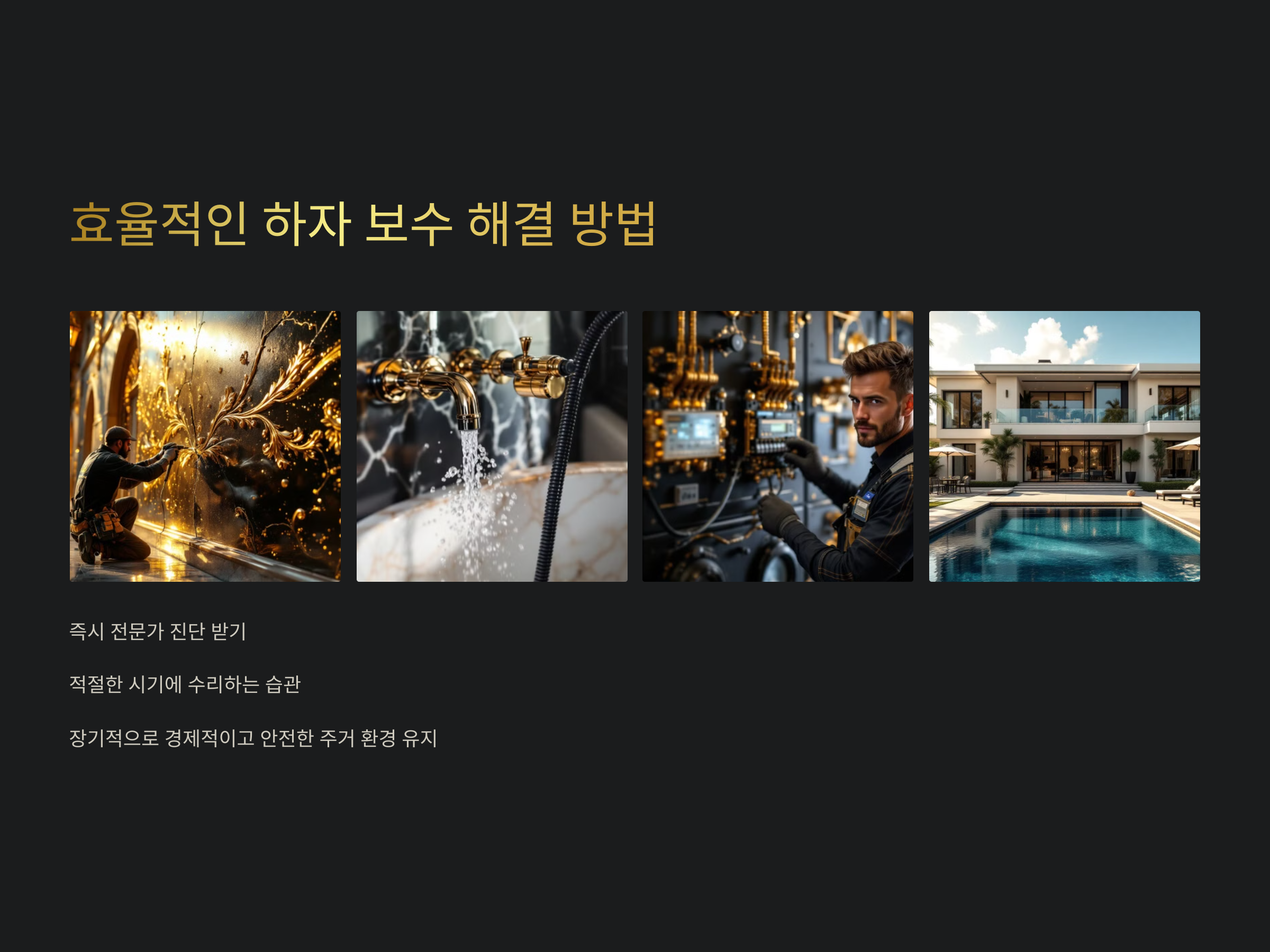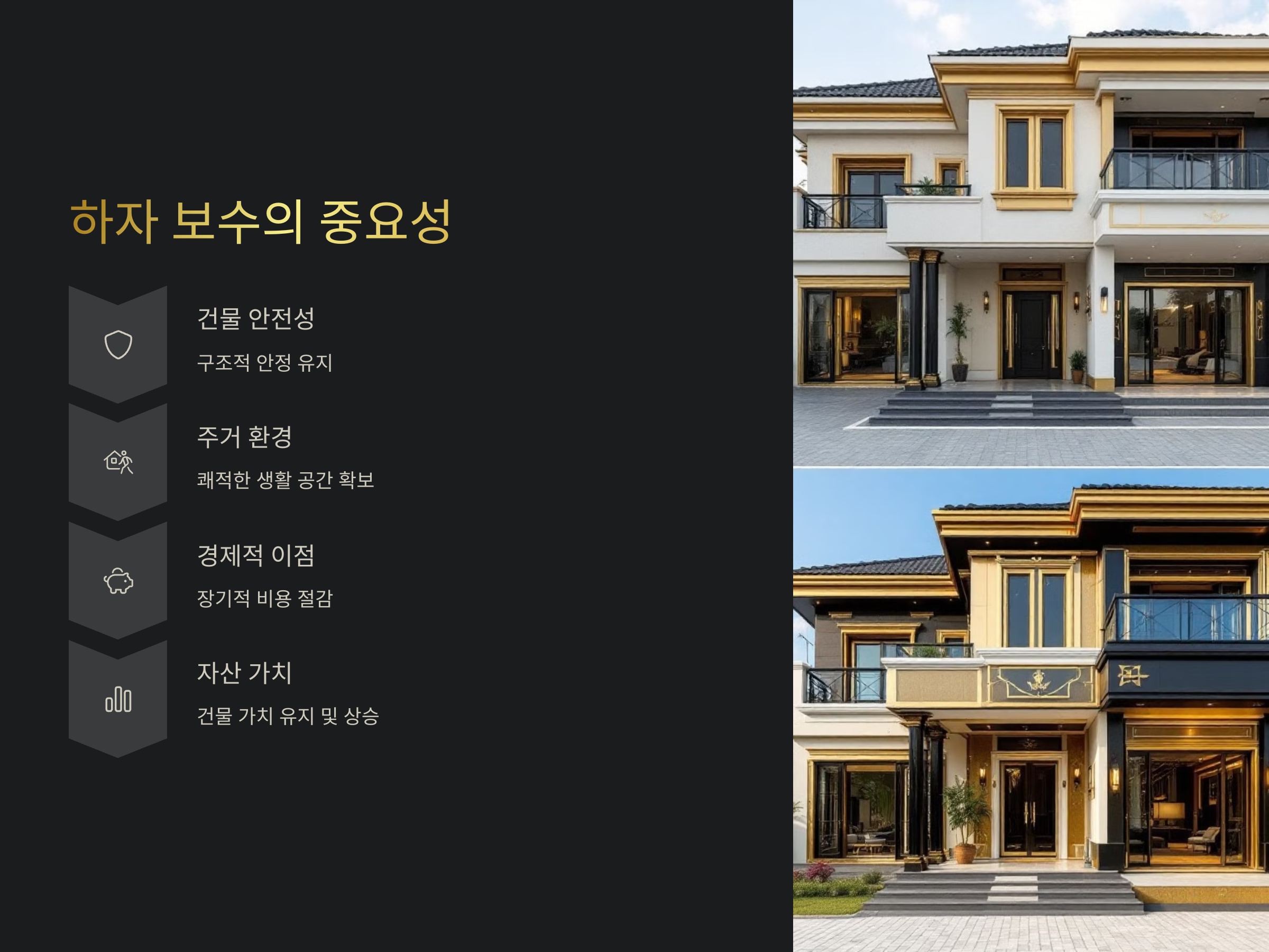 빌라 건물에서 발생하는 하자는 무시할 수 없는 문제입니다. 그러나 빠르게 전문가의 도움을 받고, 적절한 방법으로 수리하면 큰 비용을 아낄 수 있으며, 건물의 안정성을 유지할 수 있습니다. 하자 보수는 단순히 외관을 개선하는 것을 넘어서, 건물의 안전과 주거 환경의 질을 높이는 중요한 작업입니다.