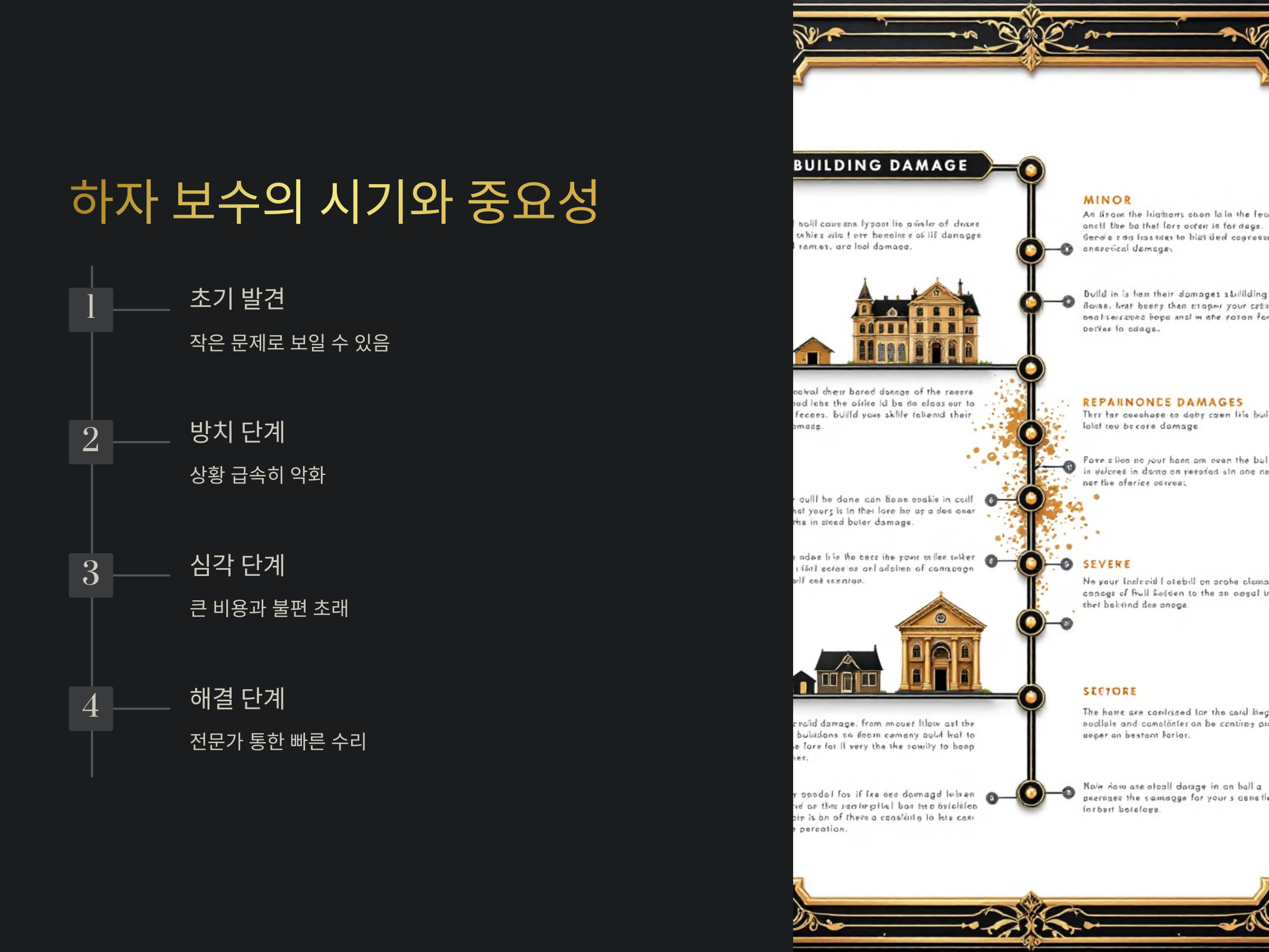 하자가 발생하면 제때 수리하지 않고 방치할 경우, 수리 비용이 배로 증가할 뿐만 아니라 건물의 내구성도 약화됩니다. 또한, 주거 환경이 불편해지며, 이에 따른 생활 질이 떨어지게 됩니다. 따라서 하자가 발생한 경우 빠르게 전문가를 찾아 점검을 받고 수리하는 것이 매우 중요합니다.
