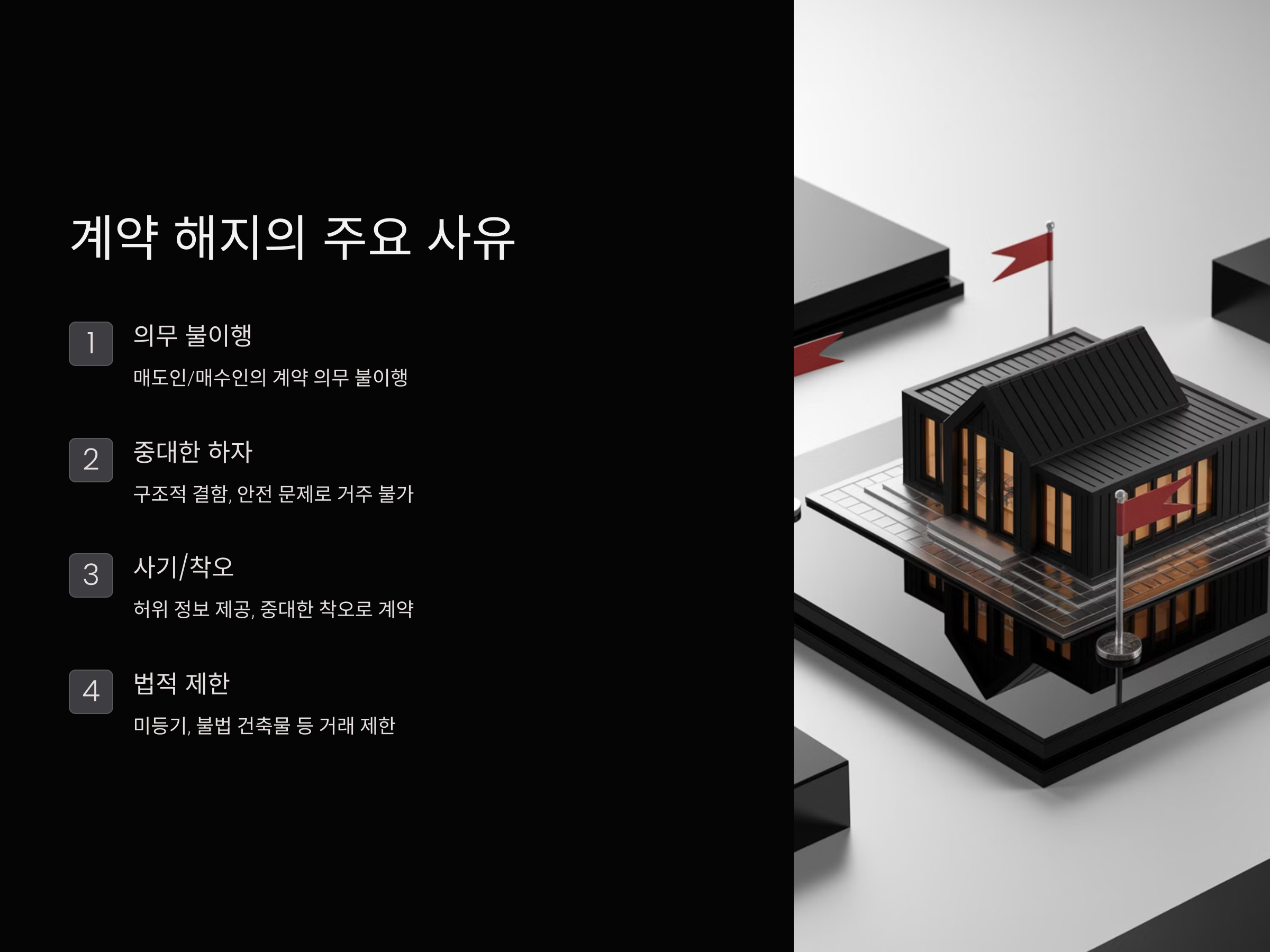 - 법적 거래 제한 사항 발생: 부동산이 미등기 상태이거나, 불법 건축물로 판명되는 등 법적으로 거래가 제한되는 경우입니다.