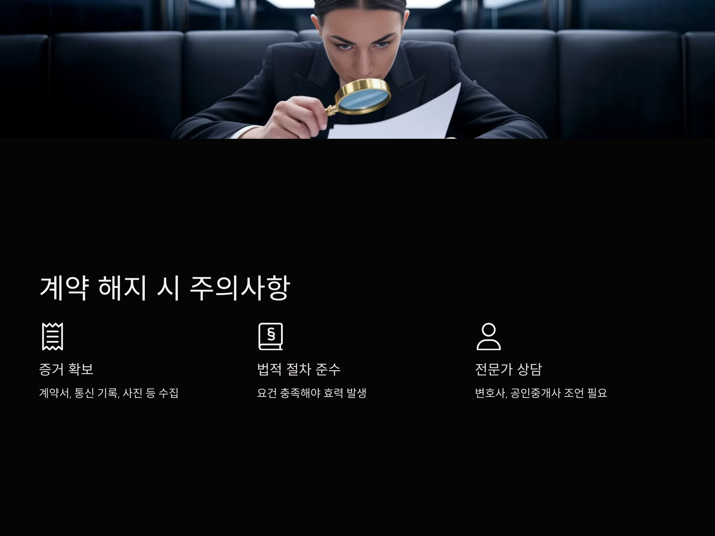 - 해지 사유 확인: 법적으로 인정되는 해지 사유가 있는지 확인합니다. 앞서 언급한 의무 불이행, 중대한 하자, 사기 등의 사유가 이에 해당합니다.
