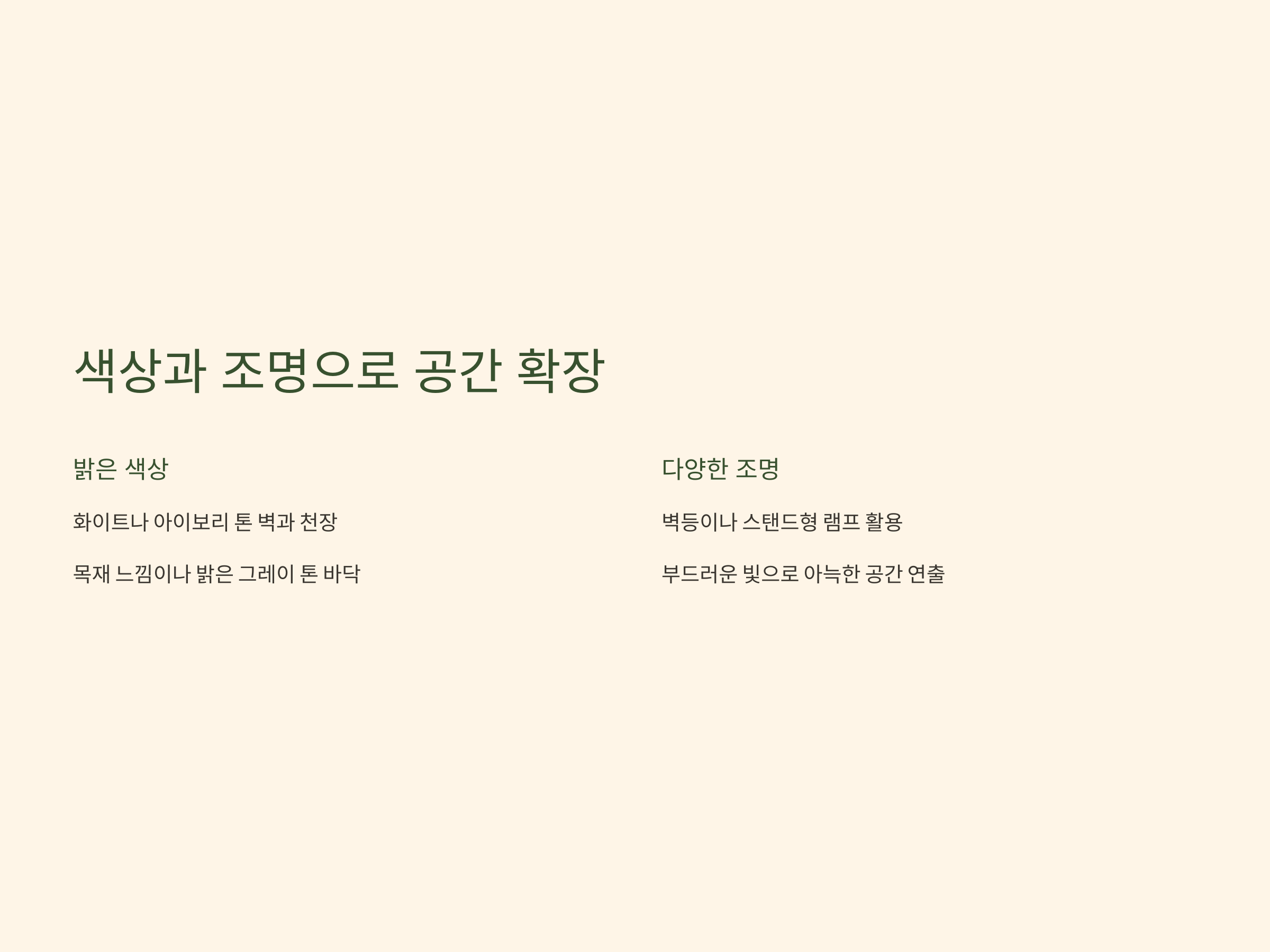 좁은 빌라에서는 색상과 조명을 적절하게 활용하는 것이 중요합니다. 벽과 천장은 밝은 색상으로 칠해주고, 바닥은 목재 느낌이나 밝은 그레이 톤으로 깔면 공간이 더 넓어 보입니다. 특히 화이트나 아이보리 톤은 공간을 환하게 만들어 주어, 작은 빌라에서도 여유로움을 느낄 수 있게 합니다.