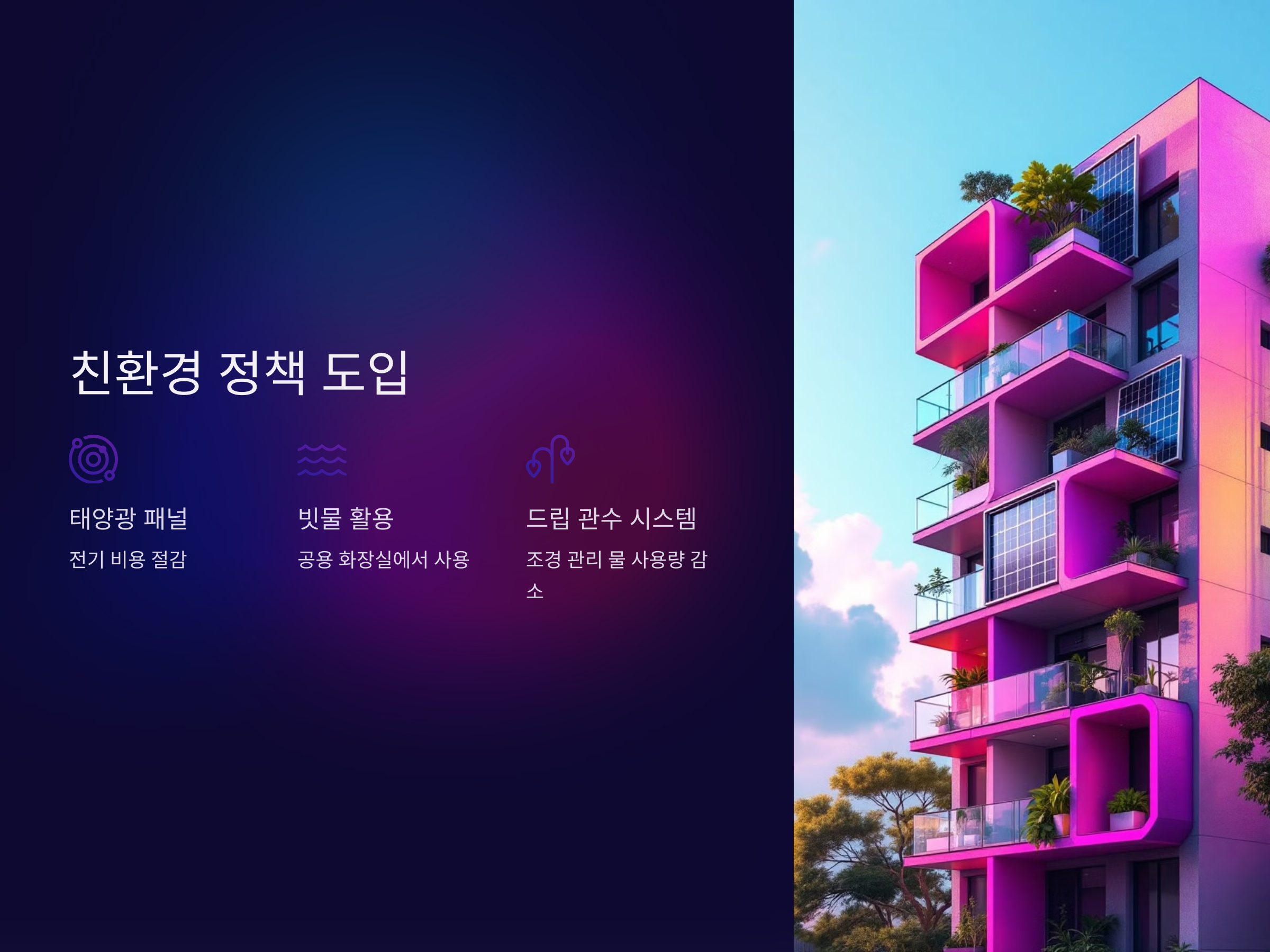 빌라 단지 내에 친환경 정책을 도입하는 것은 초기 비용이 들더라도 장기적으로 큰 절감 효과를 얻을 수 있는 방법입니다. 예를 들어, 태양광 패널을 설치해 전기 비용을 절감하거나 빗물을 모아 공용 화장실에서 사용하는 방법이 있습니다. 또한, 단지 내 조경을 관리하는 데 있어 물 사용을 줄이기 위한 드립 관수 시스템을 도입하면 물 사용량을 줄일 수 있습니다. 친환경 정책은 관리비 절감뿐만 아니라, 빌라 단지를 더욱 환경 친화적인 공간으로 만들 수 있습니다