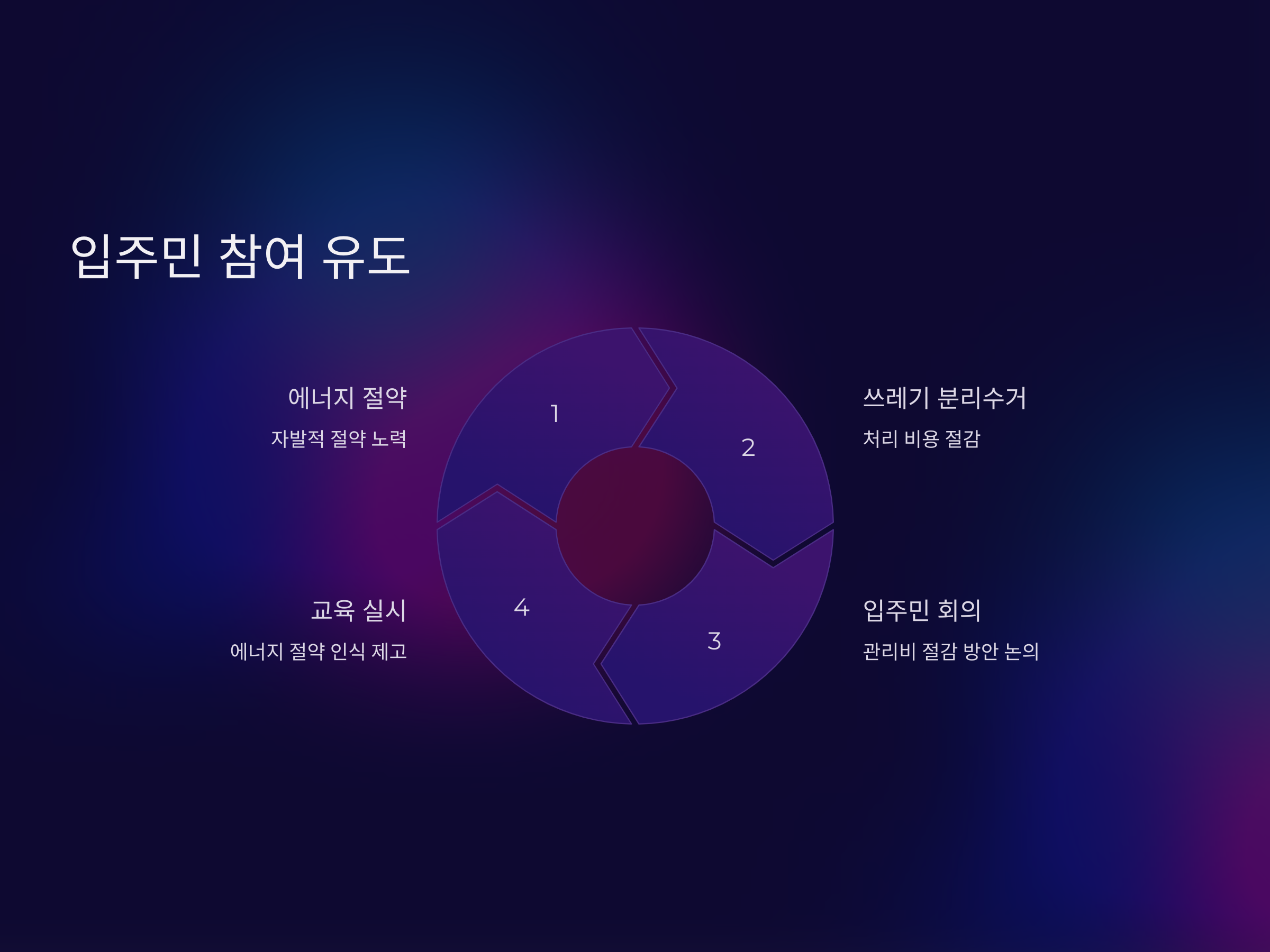 입주민들의 자발적인 참여 없이는 관리비 절감이 어렵습니다. 입주민들이 에너지를 절약하려는 노력을 기울이고, 쓰레기 분리수거 규정을 철저히 지킨다면 쓰레기 처리 비용을 줄일 수 있습니다. 특히, 음식물 쓰레기 배출을 줄이는 노력은 관리비 절감에 중요한 역할을 합니다. 입주민 회의를 통해 관리비 절감 방안을 논의하고, 다양한 의견을 모아 실천 방안을 마련하는 것도 좋은 방법입니다. 또한, 에너지 절약과 관련된 교육을 실시해 입주민의 인식을 높이는 것도 필요합니다