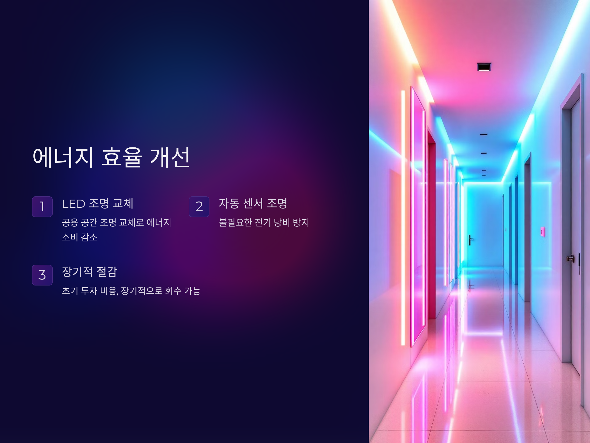 에너지 효율을 높이는 것은 관리비 절감의 핵심입니다. 공용 공간의 조명을 LED로 교체하면 에너지 소비를 크게 줄일 수 있습니다. 또한, 자동 센서 조명을 설치하여 사용하지 않는 시간에는 불이 꺼지도록 하면 불필요한 전기 낭비를 줄일 수 있습니다. 이러한 조치는 초기 투자 비용이 들지만, 장기적으로는 전기 요금을 절감하여 투자 비용을 회수할 수 있습니다
