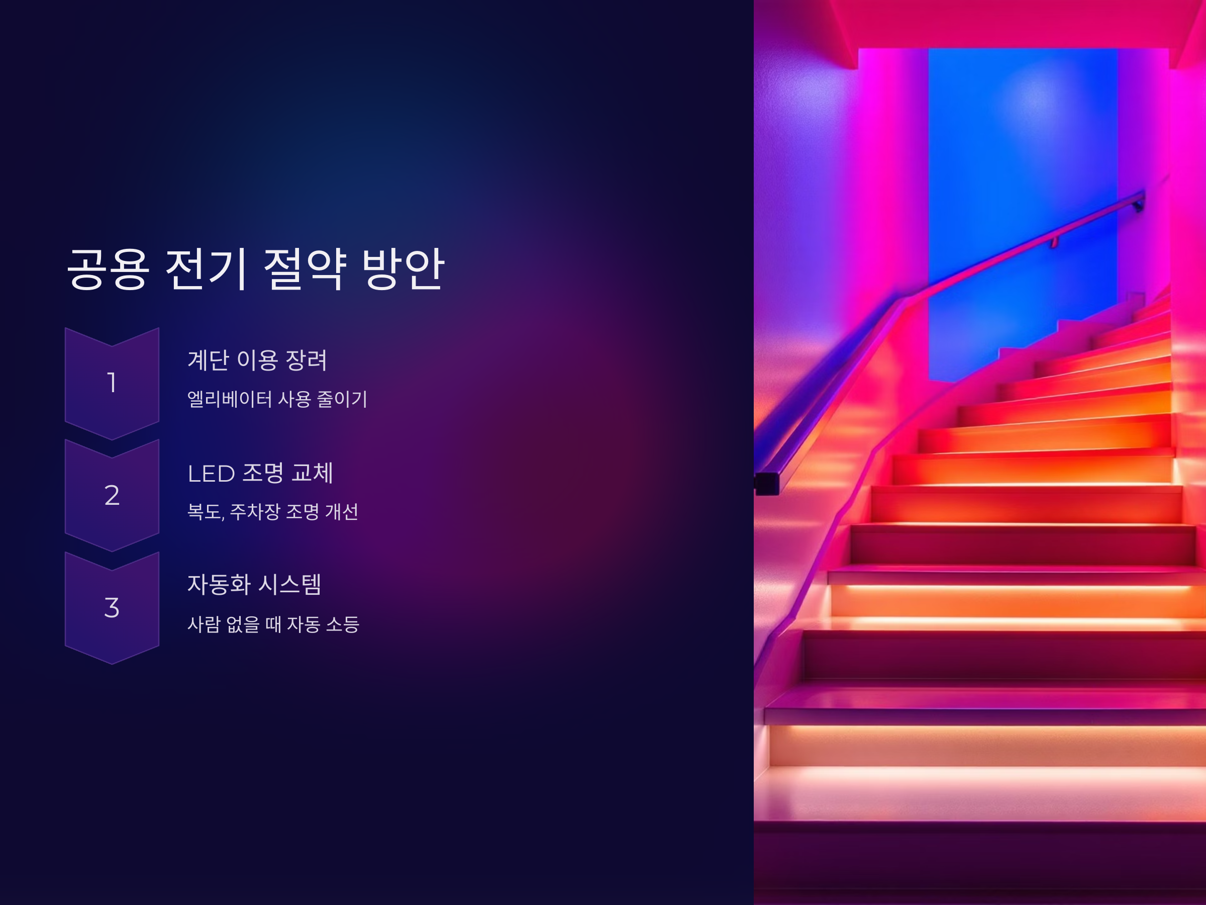 공용 전기 절약은 관리비 절감의 핵심 요소 중 하나입니다. 엘리베이터 사용을 줄이고 계단을 이용하도록 장려하는 것은 작은 변화이지만, 관리비 절감에 큰 기여를 할 수 있습니다. 또한, 복도와 주차장의 조명을 LED로 교체하고, 자동화된 조명 시스템을 도입해 사람이 없을 때 불이 자동으로 꺼지도록 하면 전기 사용량을 크게 줄일 수 있습니다. 이러한 전기 절감 노력은 매달 쌓이는 관리비 부담을 줄이는 데 중요한 역할을 합니다