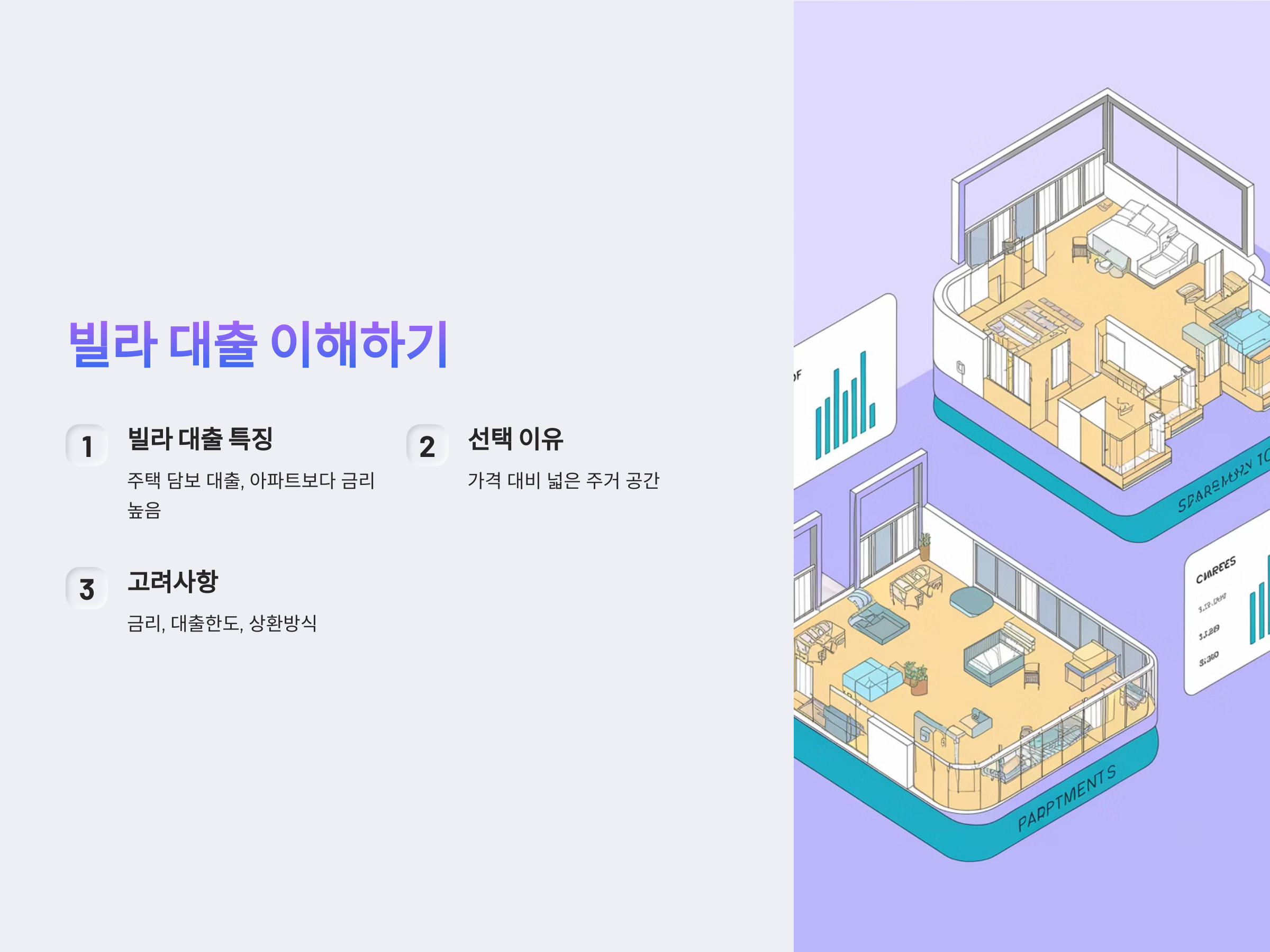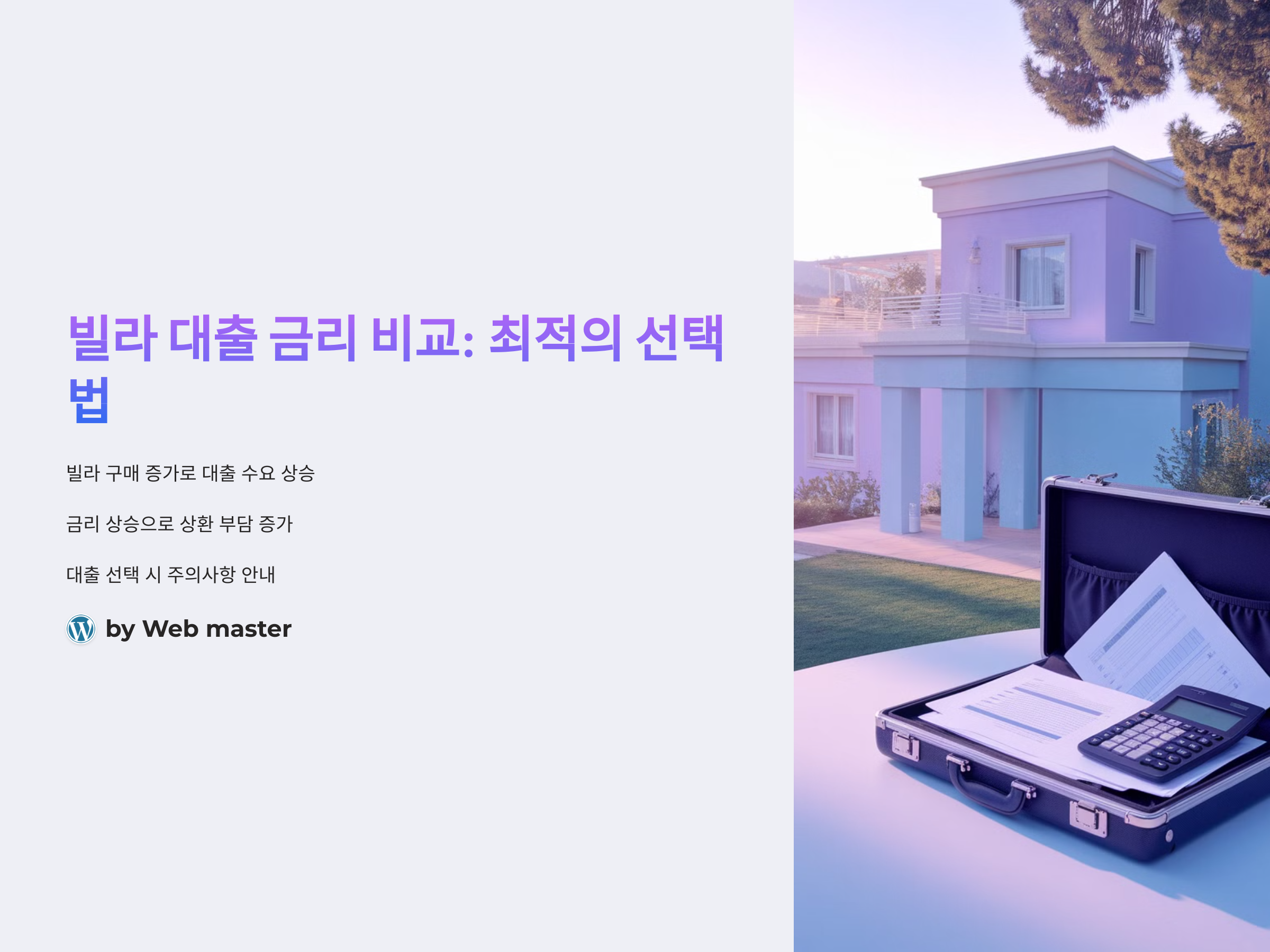빌라 대출을 선택할 때는 금리, 대출 한도, 상환 조건 등을 종합적으로 고려해야 합니다. 여러 금융기관의 상품을 비교하고, 전문가와 상담을 통해 자신에게 맞는 최적의 대출을 선택하세요. 금리가 높은 대출을 선택하지 않도록, 신중하게 결정하는 것이 내 집 마련을 위한 가장 중요한 첫걸음입니다.