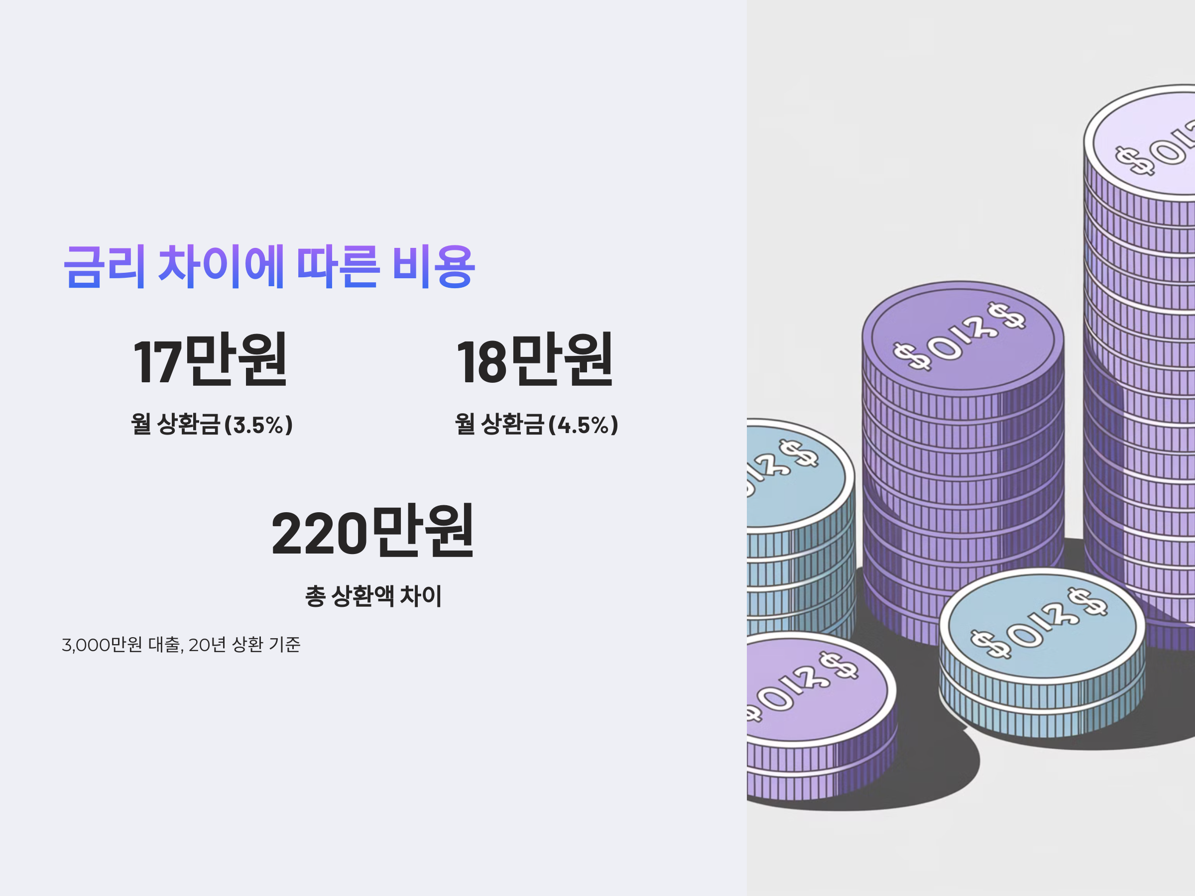 예를 들어, 3,000만원의 대출을 20년 상환기간으로 받았을 때, 금리가 3.5%인 경우와 4.5%인 경우를 비교해 보겠습니다.