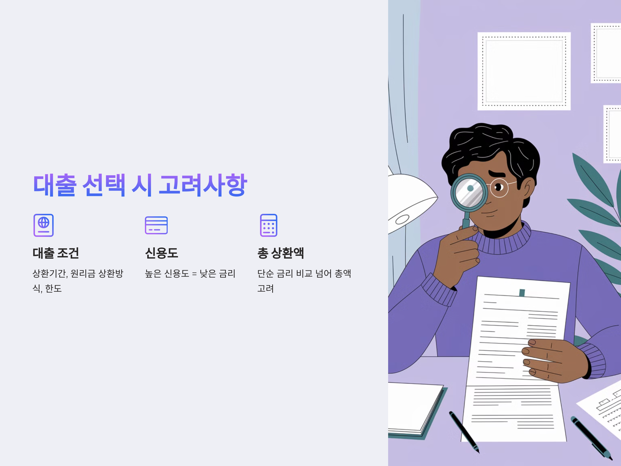 대출 금리 외에도 대출 조건도 중요한 요소입니다. 예를 들어, 대출 상환 기간이나 원리금 상환 방식, 대출 한도 등도 중요한 고려 사항입니다. 일부 은행은 대출 초기에는 낮은 금리를 제공하지만, 일정 기간 이후 금리가 급격히 상승하는 경우도 있으므로, 대출 계약서를 꼼꼼히 읽고 확인하는 것이 필요합니다.