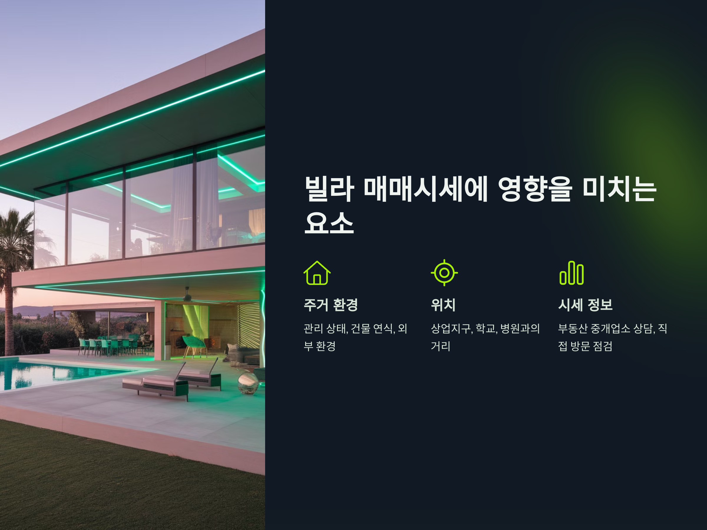 빌라 매매시세에 영향을 미치는 요소는 지역적 특성 외에도 여러 가지가 있습니다. 가장 중요한 요소 중 하나는 "주거 환경"입니다. 빌라의 관리 상태, 건물의 연식, 외부 환경 등이 매매 시세에 큰 영향을 미칩니다. 또한, 해당 빌라의 위치가 상업지구, 학교, 병원 등 생활 인프라와 얼마나 가까운지도 중요한 요소입니다.