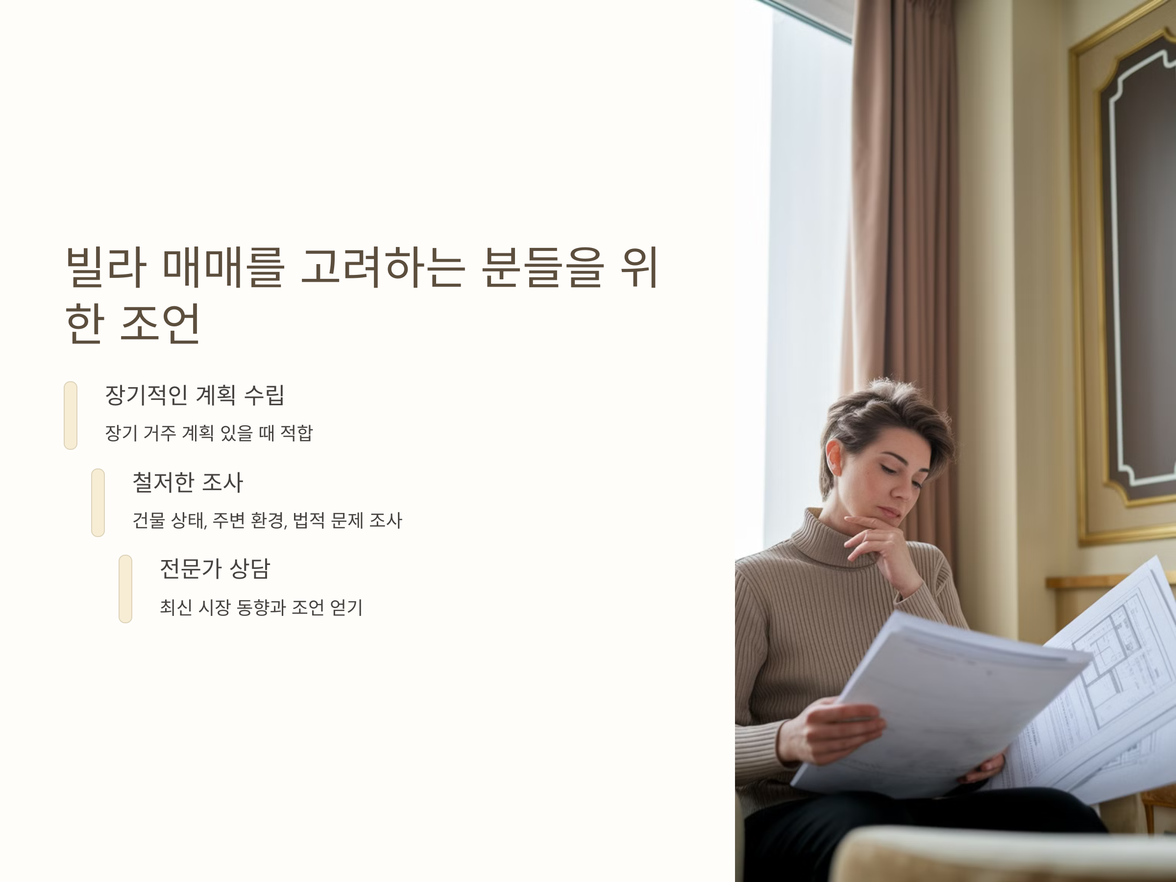 빌라 매매를 고려하신다면 다음과 같은 조언을 참고하시기 바랍니다: