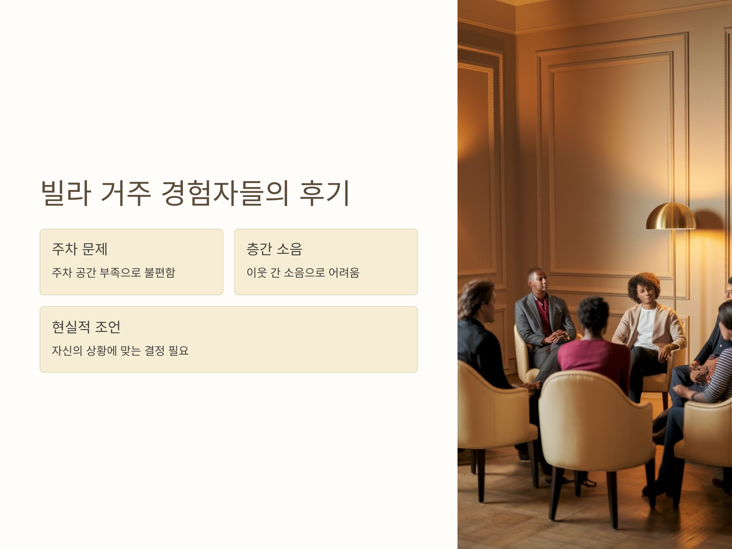 빌라에 거주하신 분들의 경험담을 통해 현실적인 조언을 얻을 수 있습니다. 예를 들어, 한 거주자는 5년 동안 빌라에 살면서 주차 문제와 층간 소음 등으로 어려움을 겪었다고 합니다. 이러한 후기를 참고하여 자신의 상황에 맞는 결정을 내리는 것이 중요합니다.