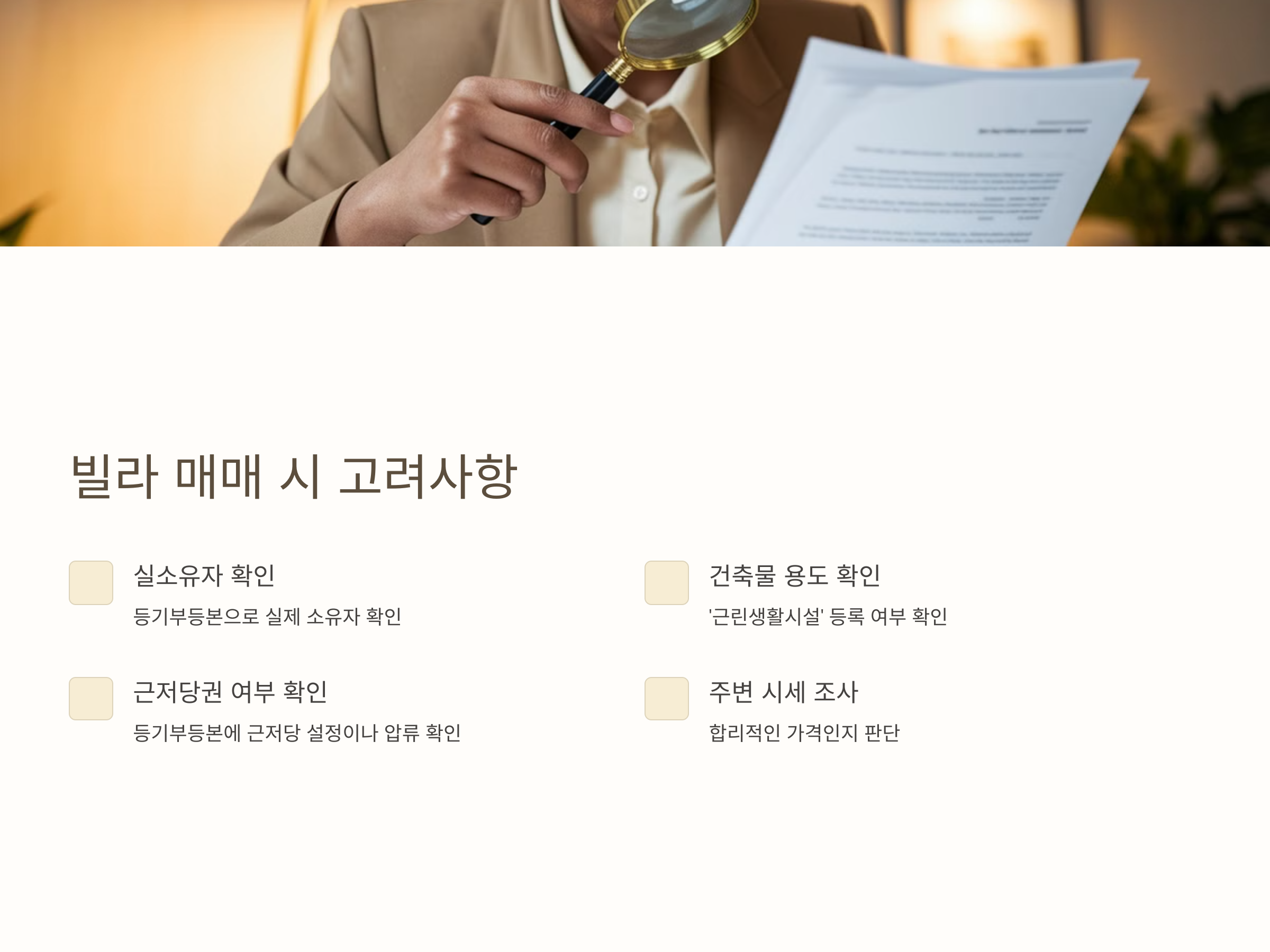 빌라 매매를 고려하신다면 다음 사항들을 주의 깊게 살펴보세요: