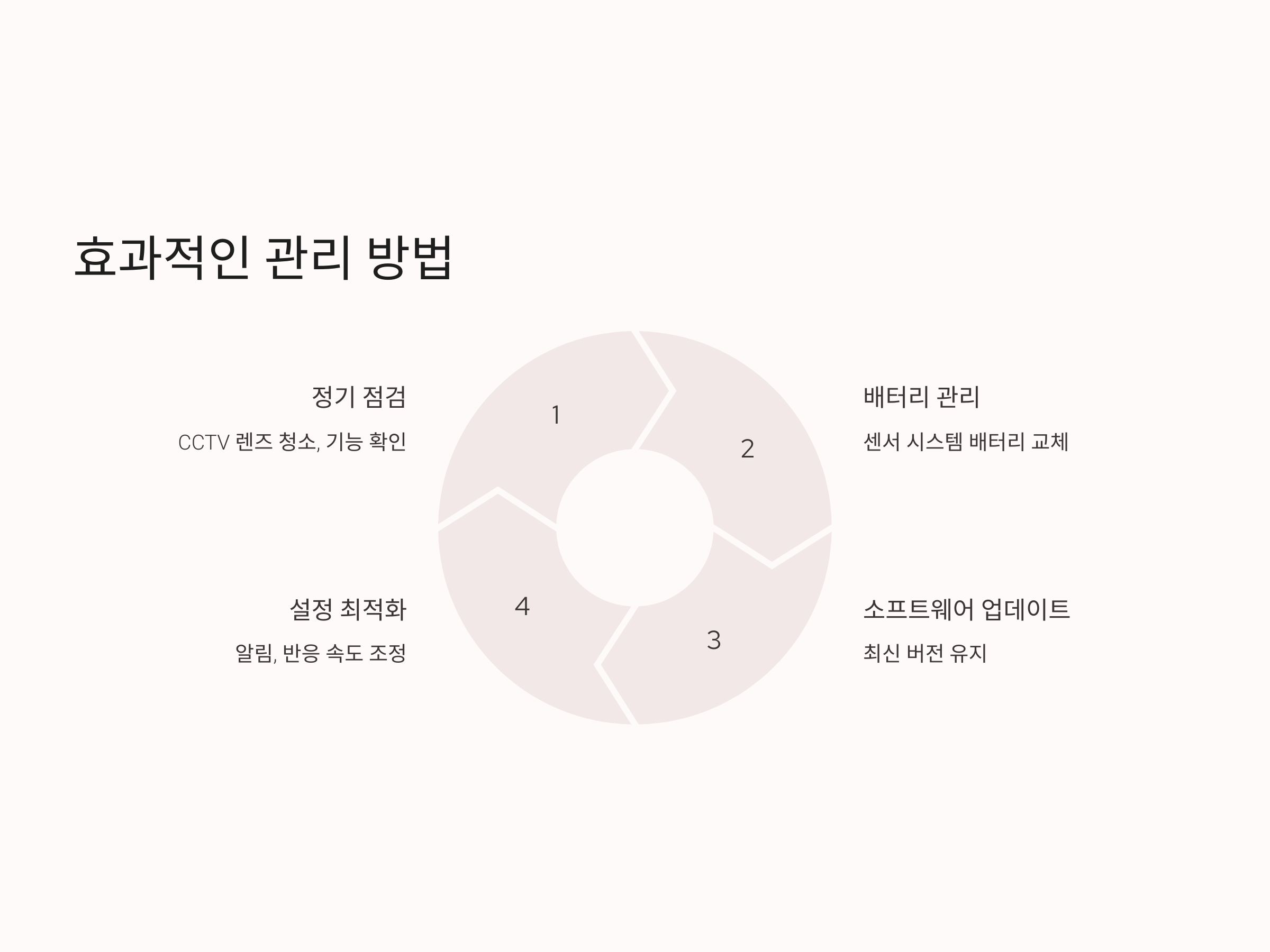방범 시스템을 설치한 후에는 꾸준한 관리가 필요합니다. 첫째, CCTV 시스템은 정기적으로 점검하여 렌즈에 먼지나 장애물이 없는지 확인해야 합니다. 둘째, 센서 시스템의 배터리 상태를 주기적으로 확인하고, 필요한 경우 교체해야 합니다. 셋째, 스마트 방범 시스템은 소프트웨어 업데이트가 이루어지는 경우가 많으므로, 최신 버전으로 업데이트하여 보안 취약점을 방지해야 합니다.