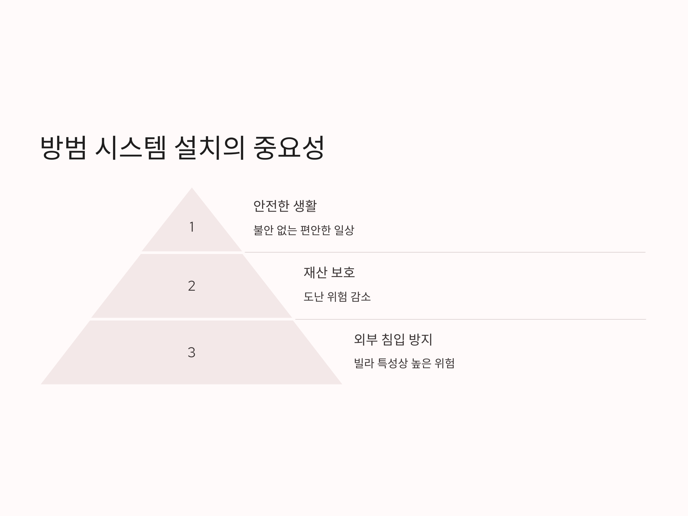 빌라에 방범 시스템을 설치하는 것은 단순한 선택이 아니라 필수적입니다. 특히, 빌라는 단독주택과는 달리 여러 가구가 함께 거주하는 공간이므로, 외부 침입자가 발생할 수 있는 가능성이 높습니다. 이로 인해 방범 시스템을 설치하지 않으면 큰 위험에 처할 수 있습니다.