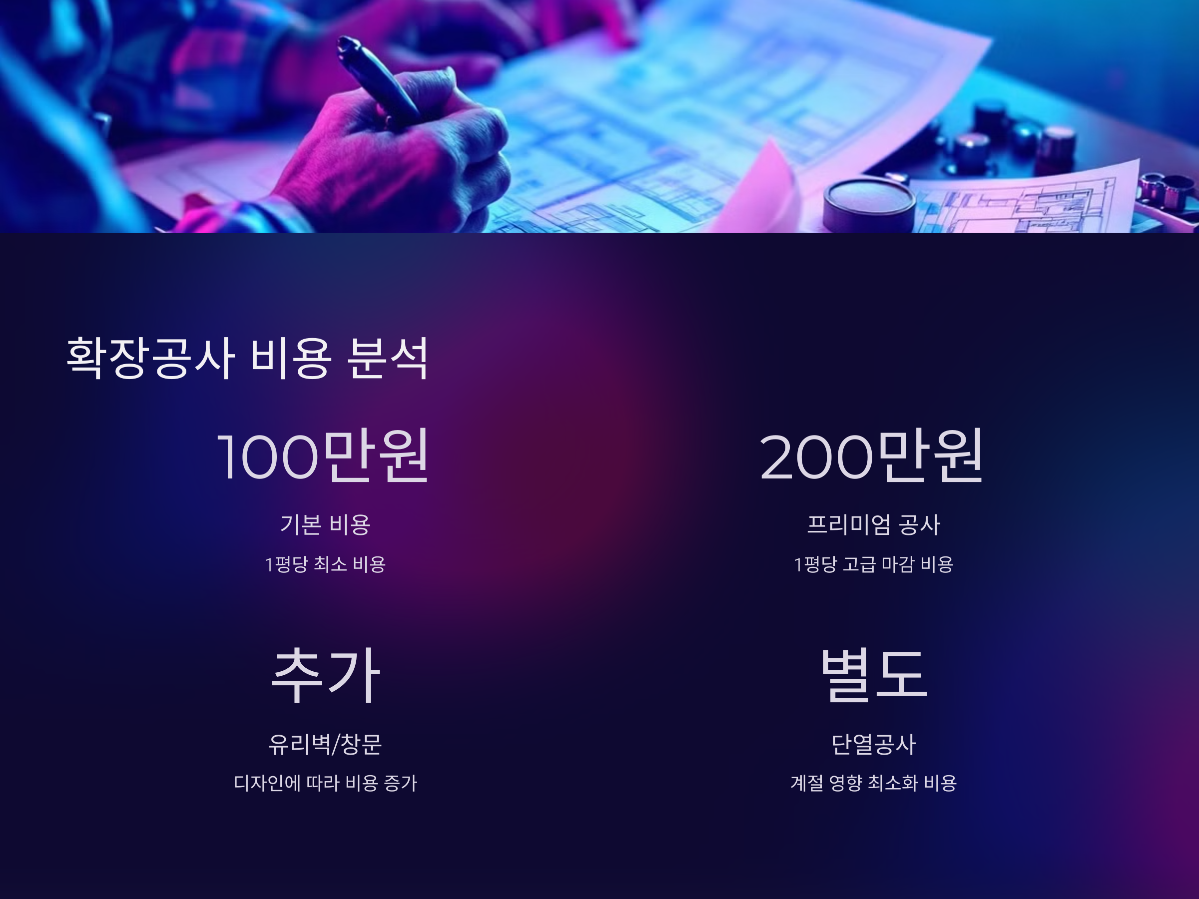 베란다 확장공사는 예상보다 비용이 많이 들 수 있습니다. 기본적으로 건축 허가와 설계에 따른 비용이 발생하며, 이는 선택하는 확장 방법에 따라 달라집니다. 기본적인 프리미엄 확장 공사는 대체로 1평당 100만 원에서 200만 원 정도의 비용이 발생할 수 있습니다. 하지만 재료, 공사 난이도, 시공업체에 따라 비용은 상이할 수 있습니다.