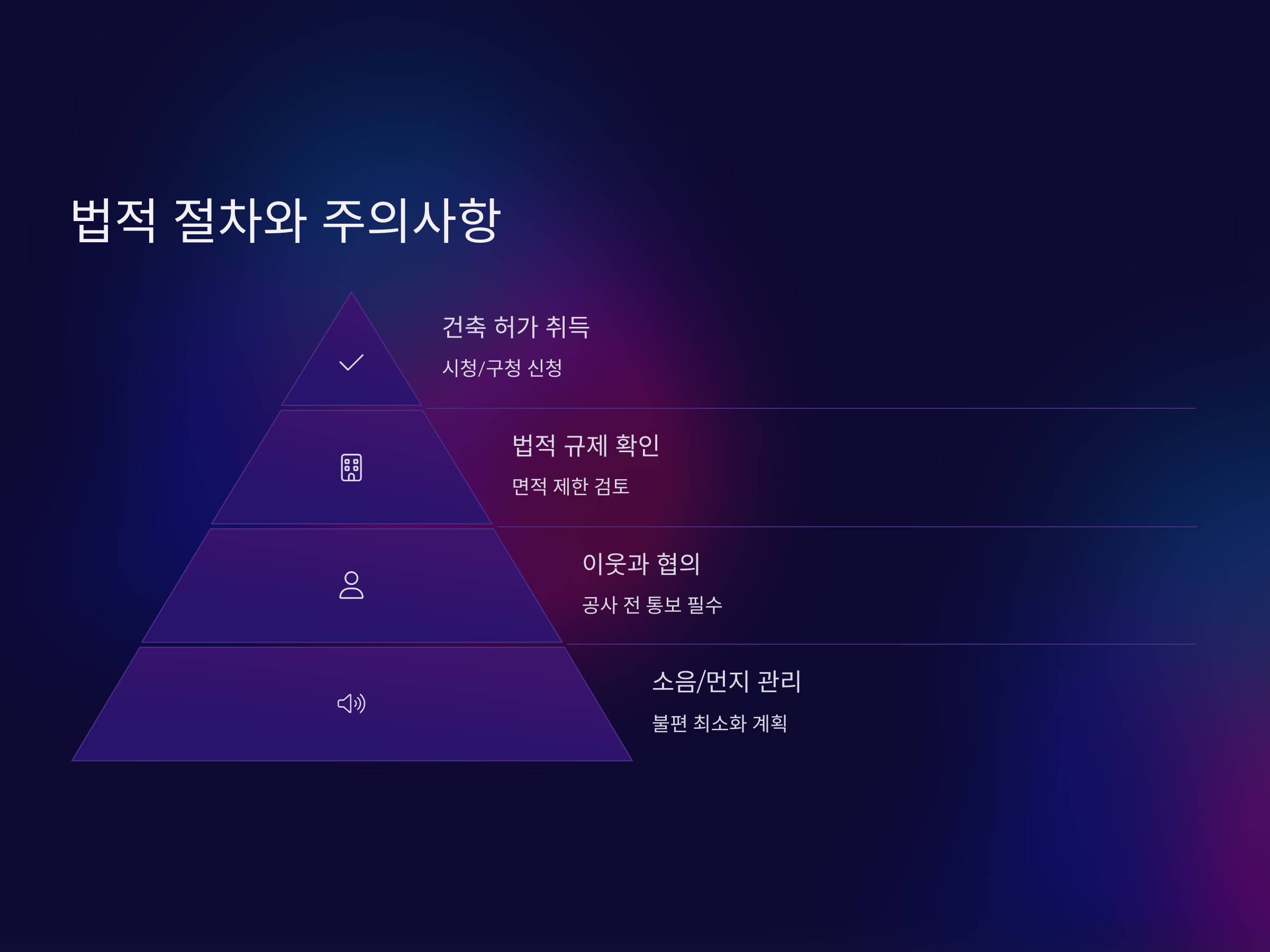 또한, 층간 소음이나 이웃과의 관계도 고려해야 합니다. 이웃과의 원만한 관계 유지를 위해 확장 공사 전 미리 이웃에게 통보하거나 협의하는 것이 좋습니다. 또한, 시공이 진행되는 동안 소음이나 먼지가 발생할 수 있기 때문에, 이를 미리 공지하여 불편을 최소화할 수 있도록 해야 합니다.