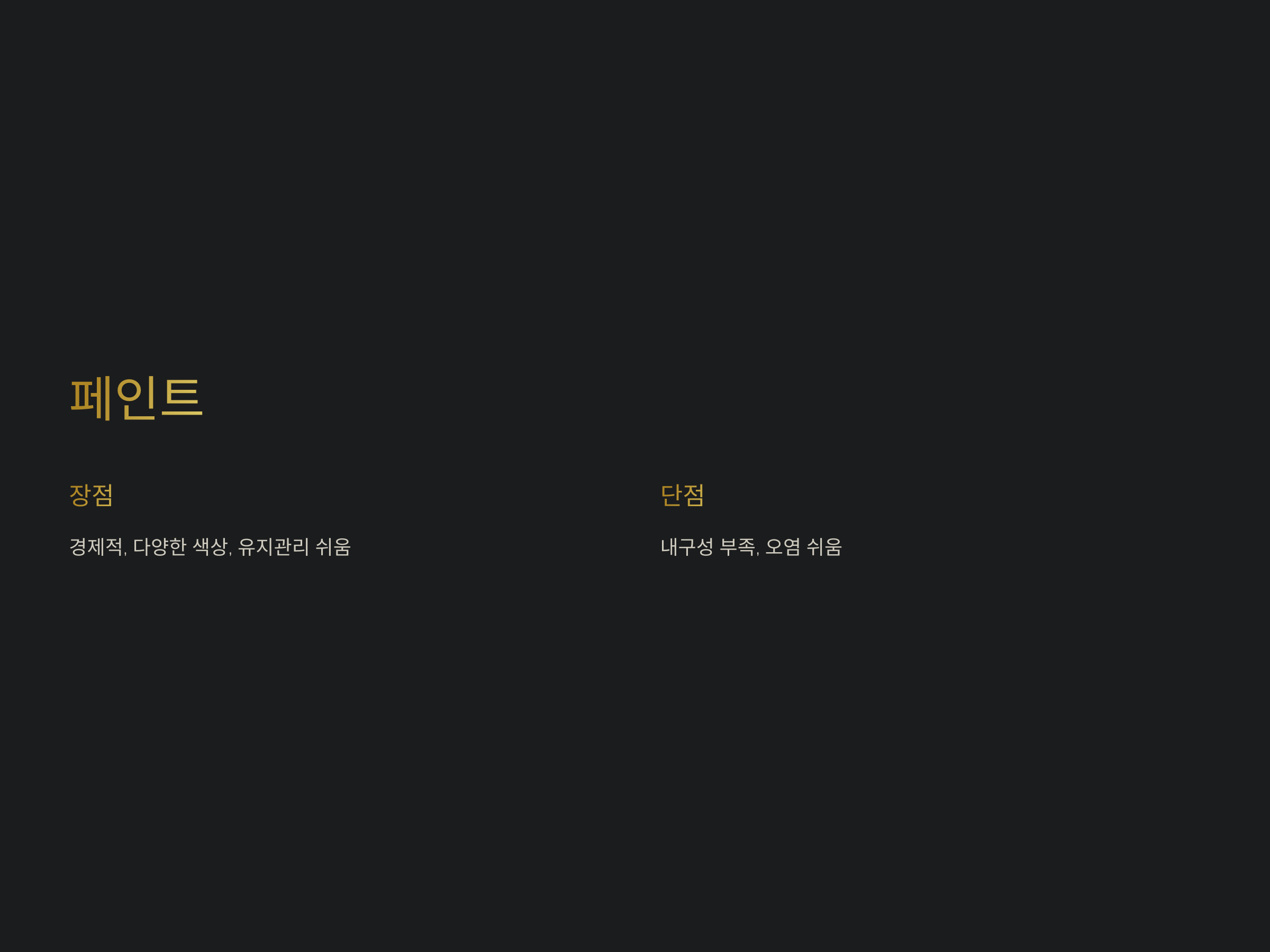 페인트는 가장 일반적이고 경제적인 벽면 마감재 중 하나입니다. 다양한 색상과 마감 질감을 제공하기 때문에 인테리어 스타일에 맞게 자유롭게 선택할 수 있습니다. 또한, 관리가 쉬운 편이며, 필요한 경우에는 쉽게 재도장이 가능하여 유지비용이 상대적으로 저렴합니다.