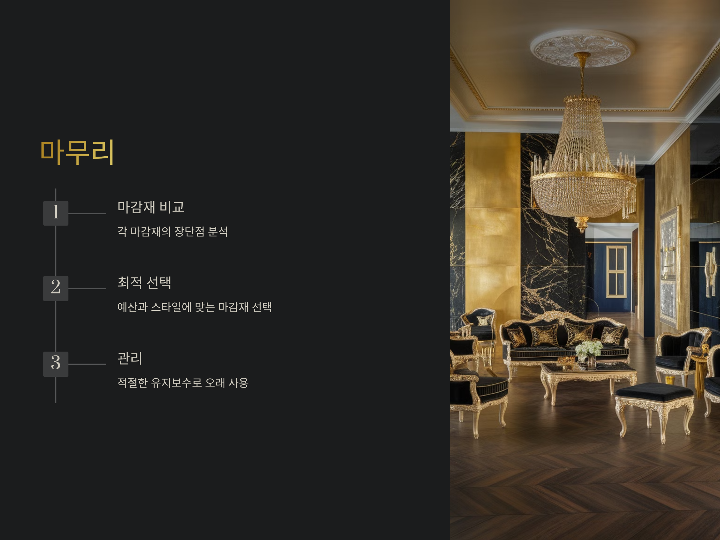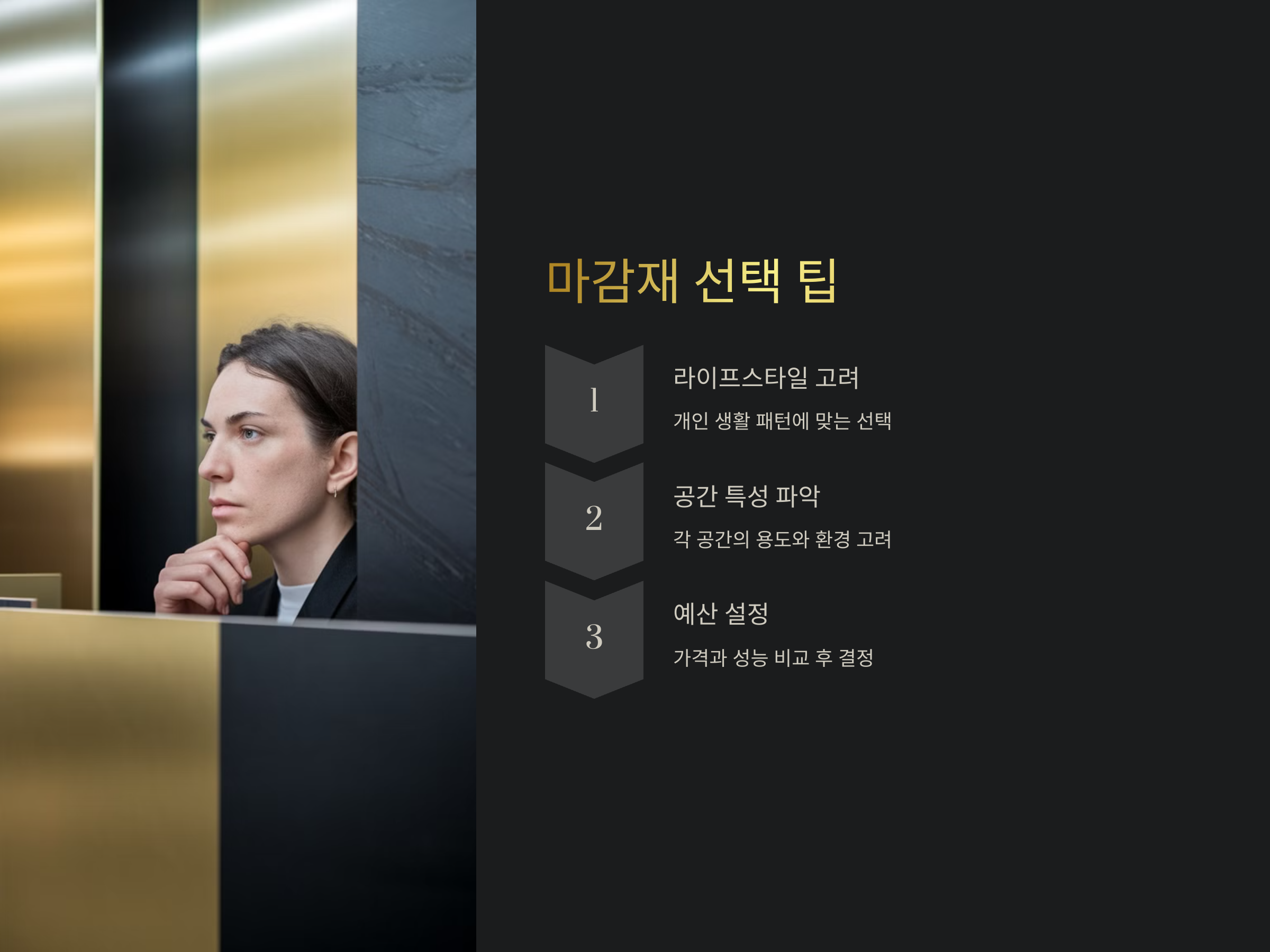 - 가격: 예산을 고려한 합리적인 선택이 필요합니다. 비싼 마감재가 무조건 좋은 것은 아니므로, 성능 대비 가성비를 고려해야 합니다.