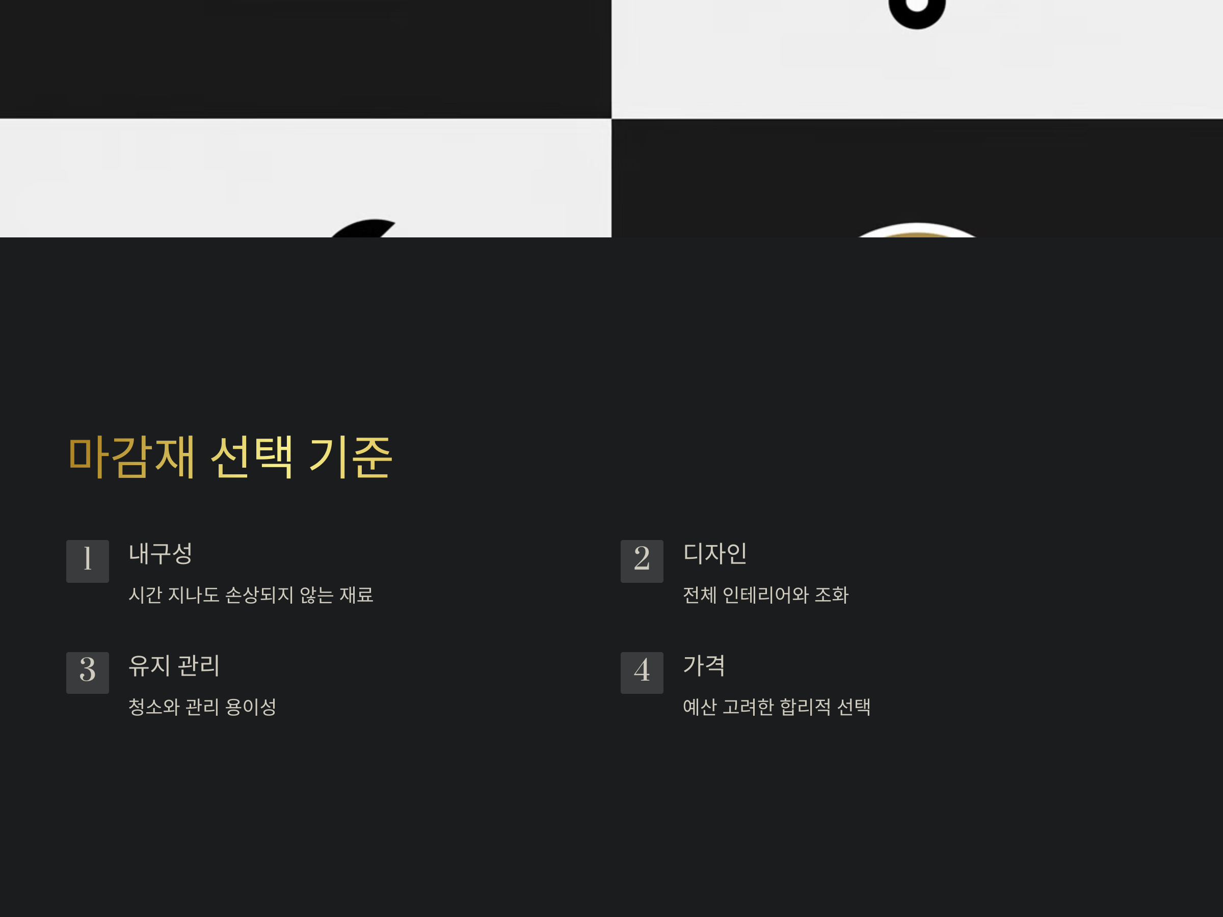 다음은 벽면 마감재 선택 시 고려해야 할 주요 기준입니다:
