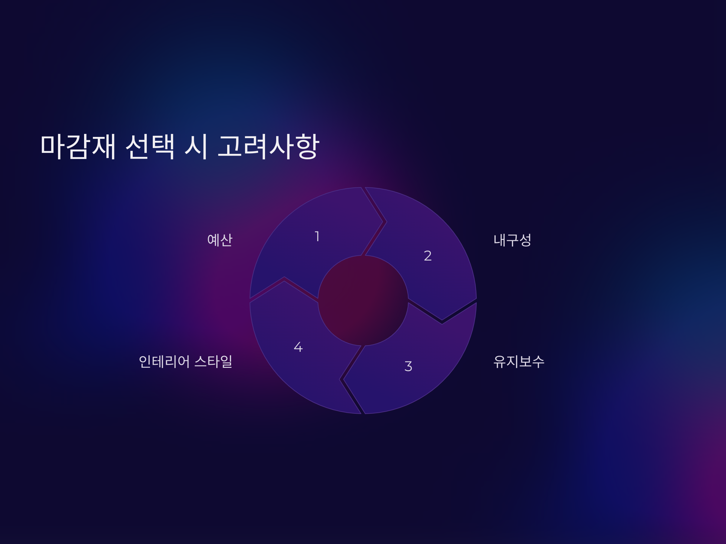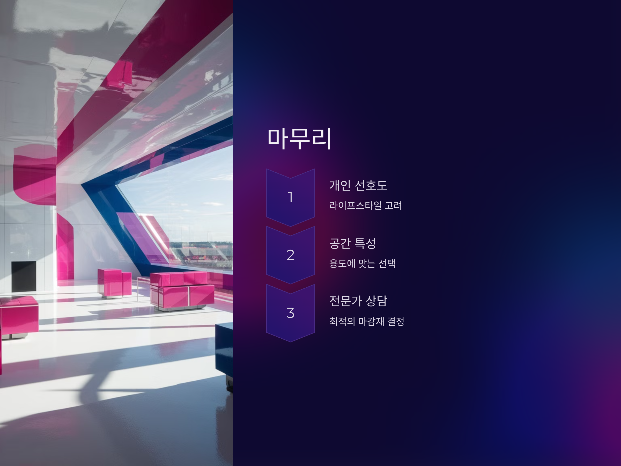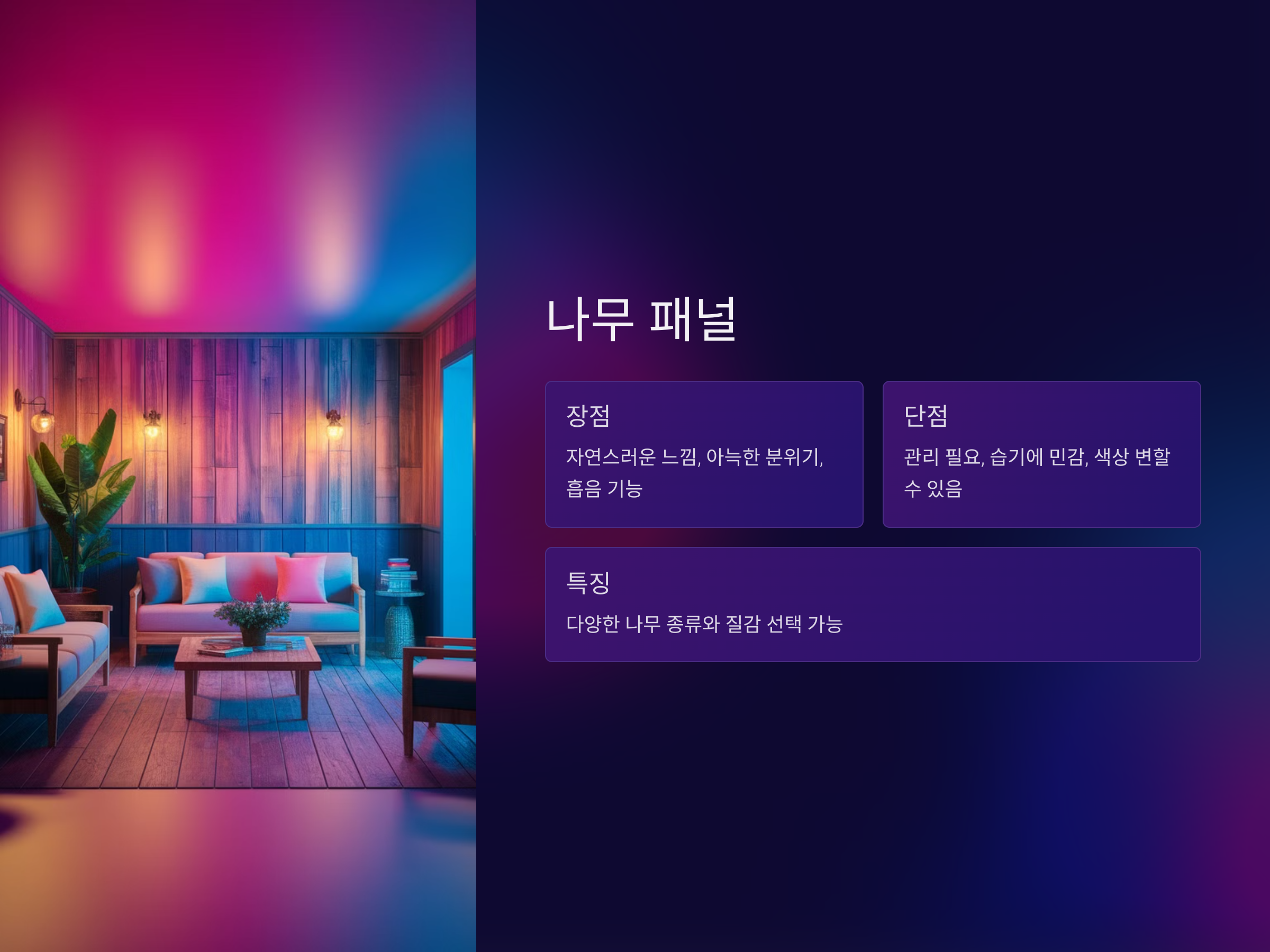 나무 패널은 자연스러운 느낌을 선호하는 사람들에게 적합한 마감재입니다. 나무의 질감은 따뜻하고 아늑한 분위기를 만들어 주기 때문에 거실, 침실 등에 잘 어울립니다. 나무 패널은 또한 흡음 기능이 있어 소음 문제를 해결하는 데 도움이 될 수 있습니다. 단, 나무는 습기와 온도에 민감하므로 관리가 필요하며, 시간이 지날수록 색상이 변할 수 있습니다.