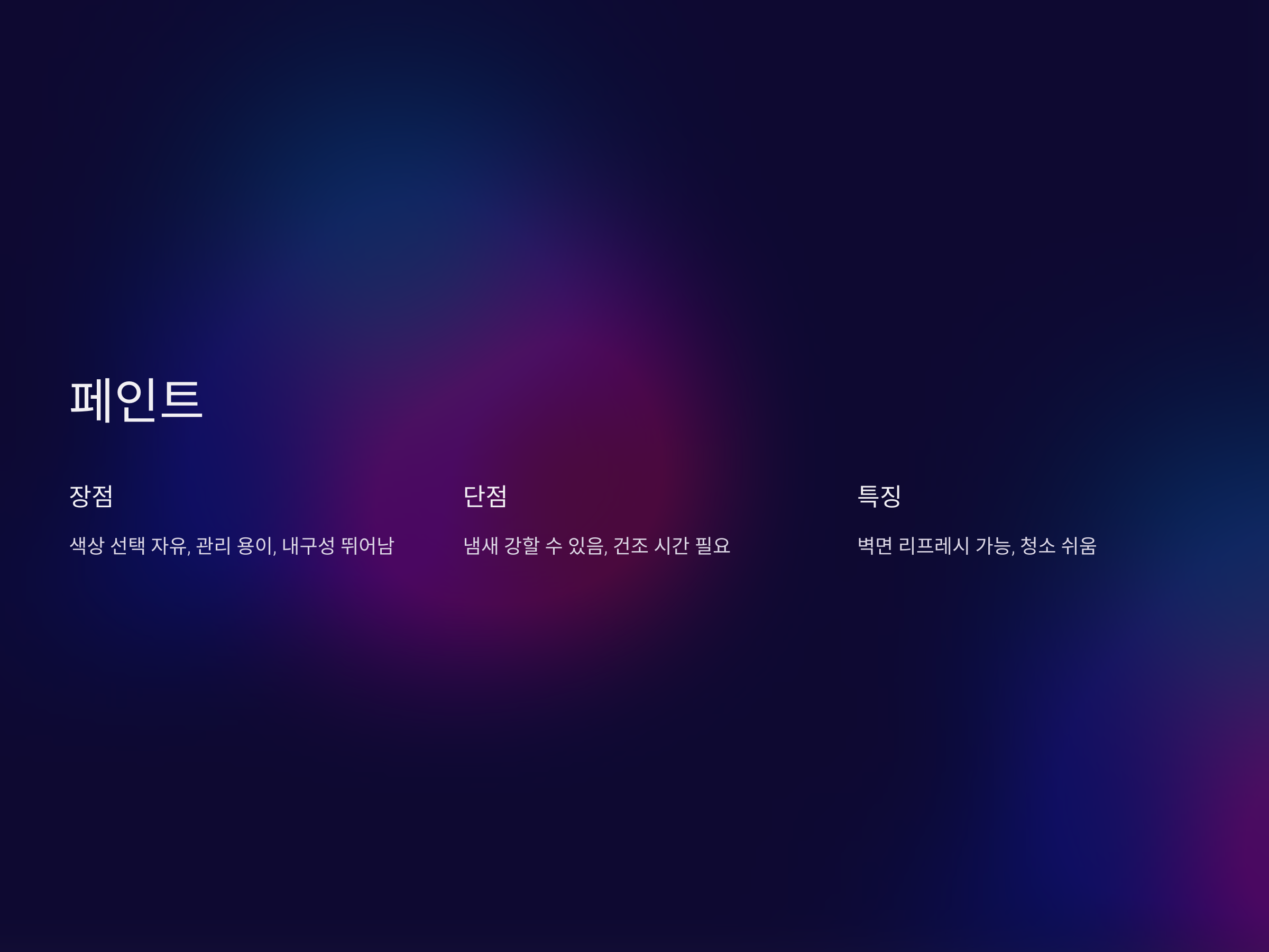페인트는 벽면 마감재로 매우 인기가 높습니다. 색상 선택이 자유롭고, 벽면 전체에 고르게 색을 칠할 수 있기 때문에 미적인 효과가 뛰어납니다. 또한, 페인트는 벽지보다 내구성이 높고, 관리가 간편하며, 청소가 용이하다는 장점이 있습니다. 페인트를 사용하면 벽면을 주기적으로 리프레시할 수 있어 새로운 느낌을 줄 수 있습니다.
