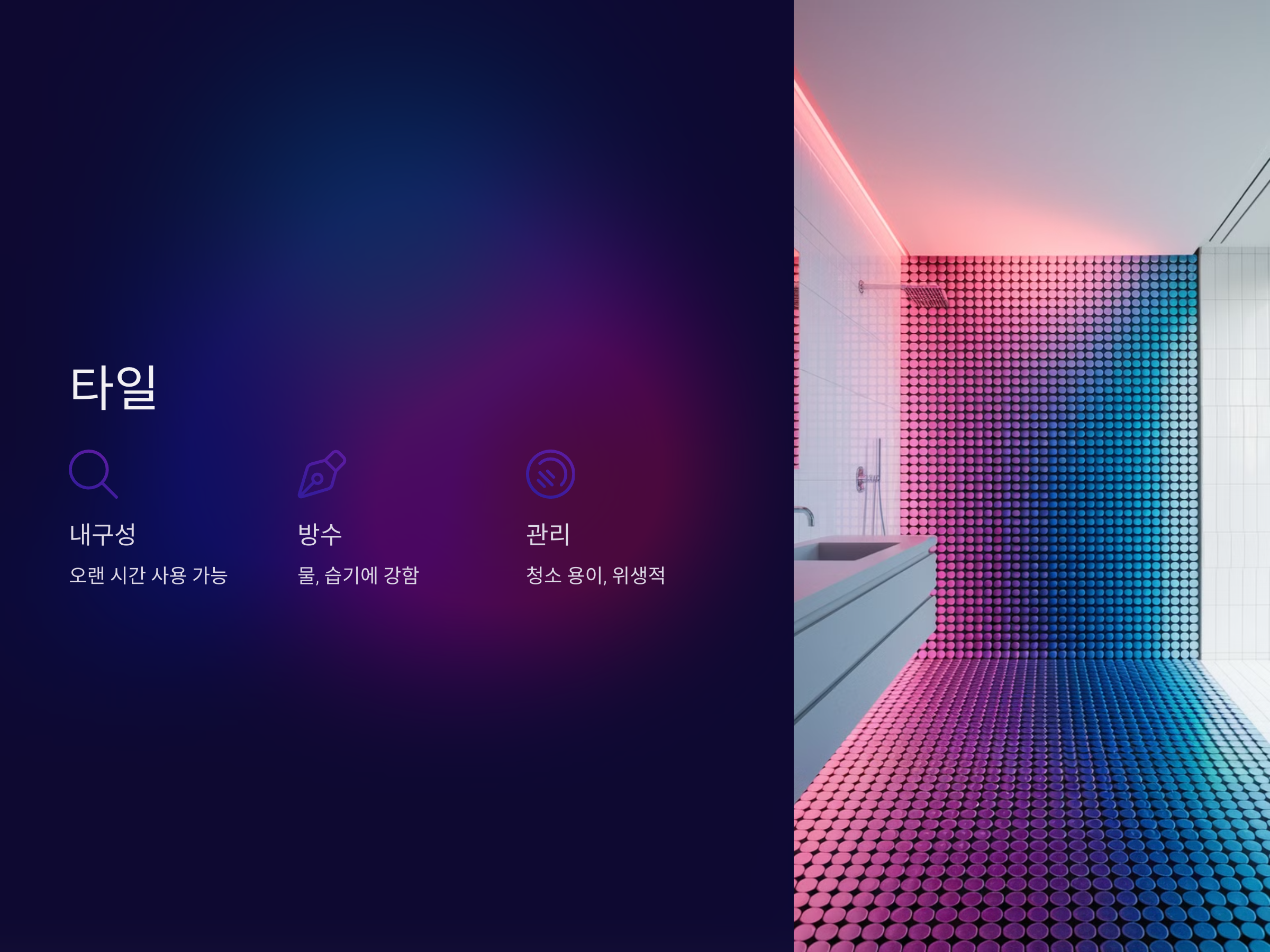 타일에는 세라믹 타일, 포세린 타일, 모자이크 타일 등이 있으며, 각각의 타일은 용도와 디자인에 따라 선택할 수 있습니다. 특히 욕실이나 주방에는 세라믹 타일이 적합합니다.