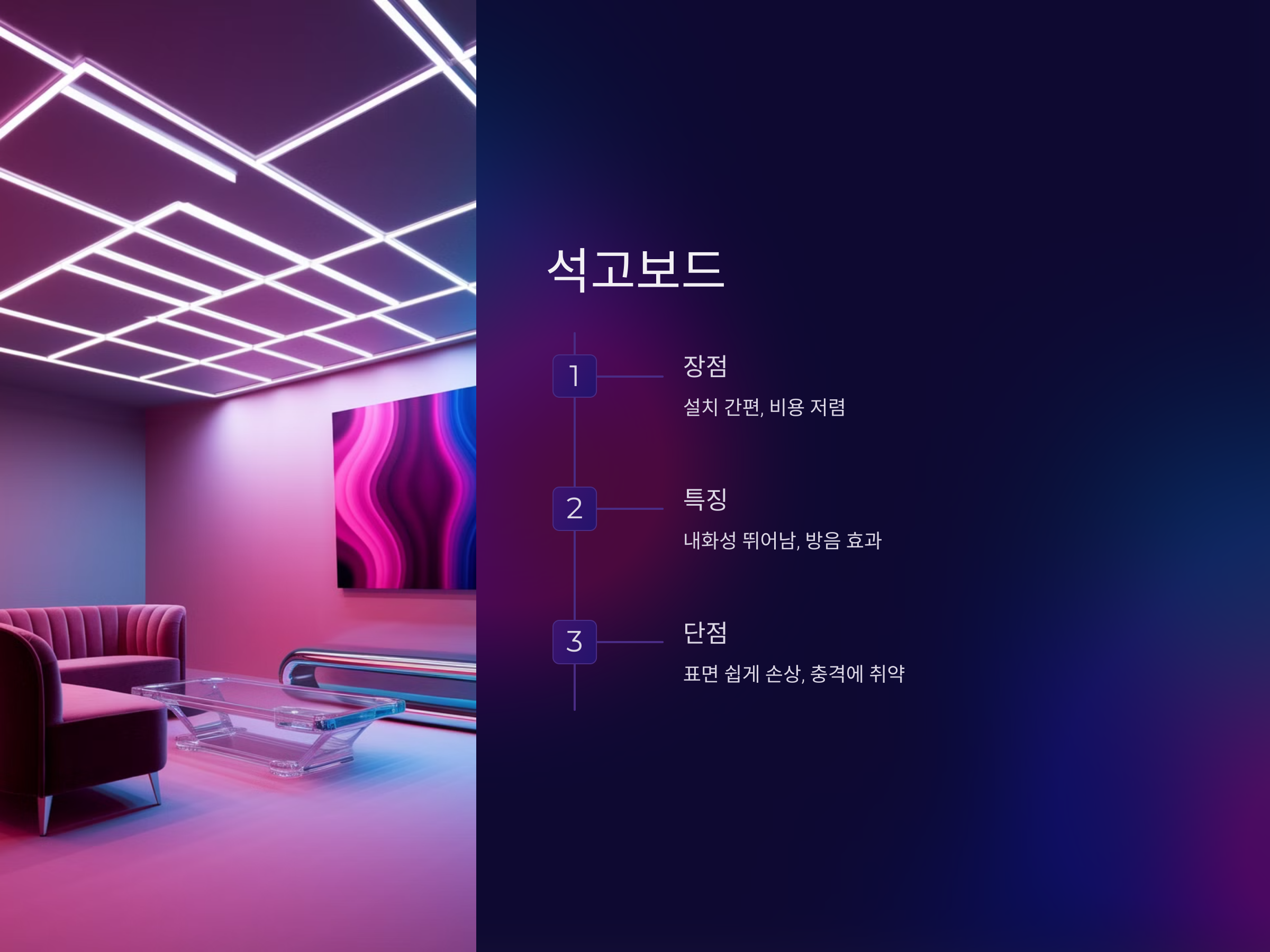 석고보드는 가볍고 설치가 쉬운 벽면 마감재입니다. 석고보드는 내화성이 뛰어나고, 추가적인 방음 효과도 제공할 수 있어 주거 공간에서 유용하게 사용됩니다. 벽지나 페인트와 결합하여 다양한 스타일을 연출할 수 있으며, 복잡한 구조물이나 디자인을 만들 때에도 유용하게 사용됩니다.