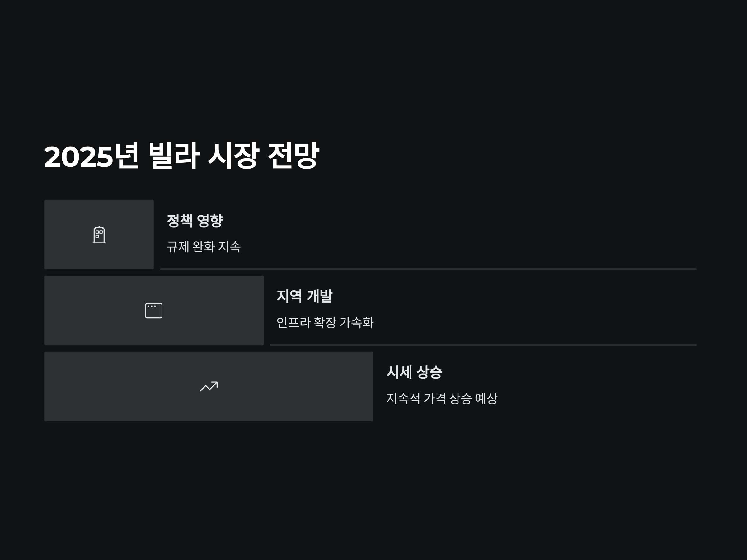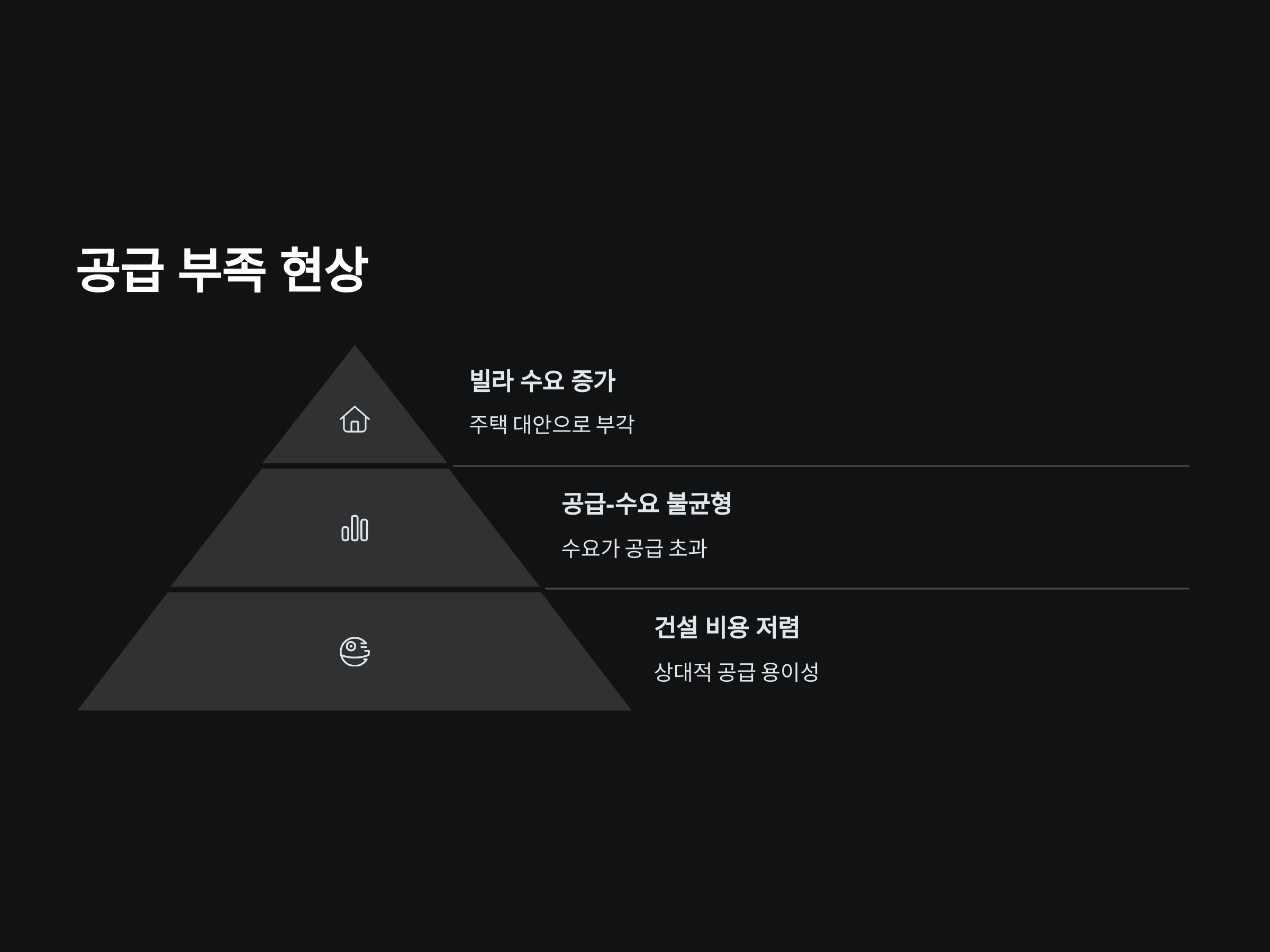 빌라는 상대적으로 건설 비용이 낮고, 공급이 비교적 용이하기 때문에 공급 부족 문제를 해결할 수 있는 대안으로 부각되고 있습니다. 이러한 이유로 빌라에 대한 수요가 증가하면서, 시세 상승을 이끌고 있습니다.