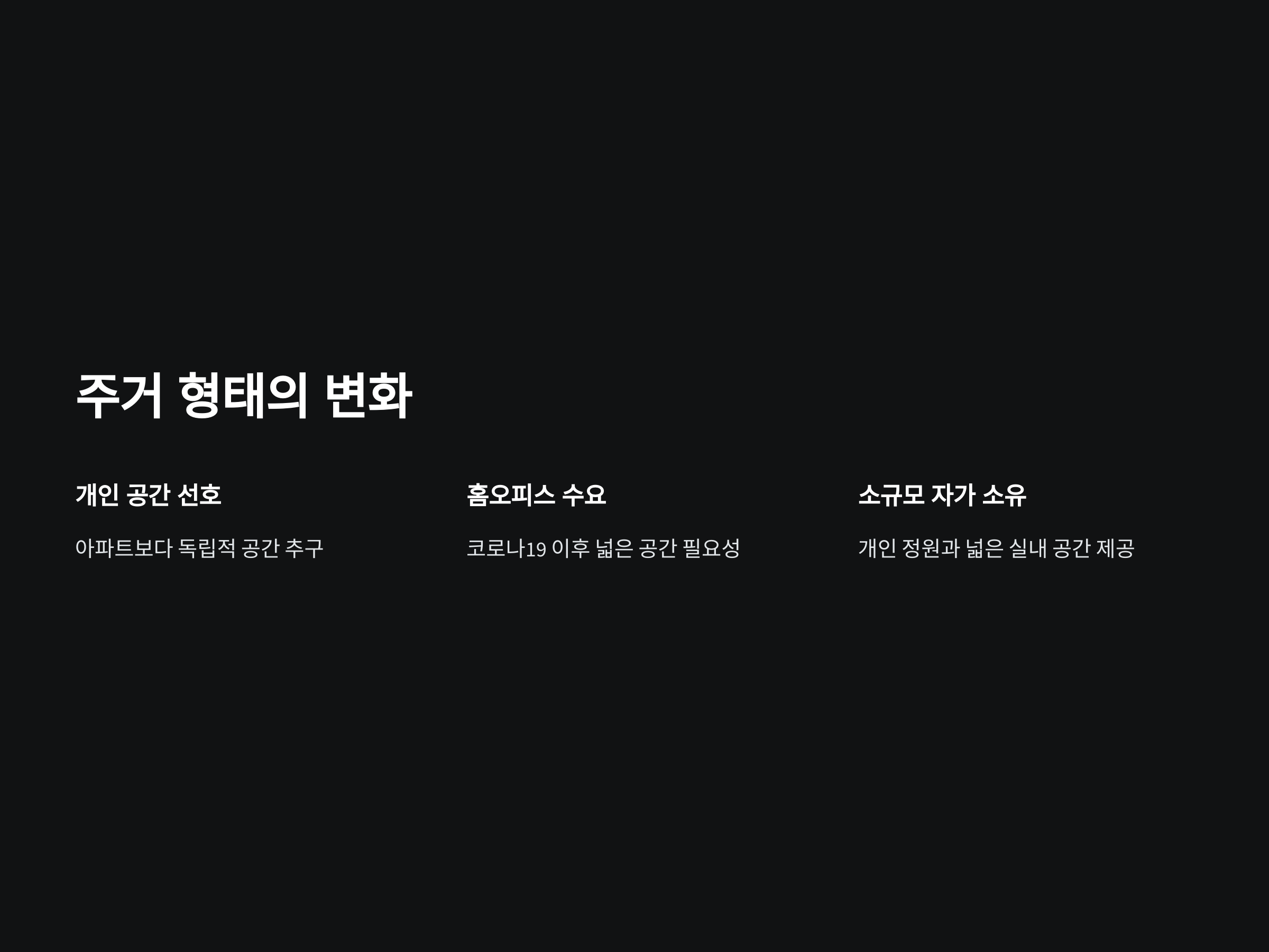 최근 몇 년간 주거 형태에 대한 사람들의 선호도가 변화하고 있습니다. 아파트에서 벗어나 개인적인 공간을 선호하는 사람들이 증가하면서 빌라에 대한 수요가 늘어나고 있습니다. 특히, 코로나19 이후 홈오피스와 같은 다양한 형태의 거주 공간에 대한 관심이 커지면서, 넓은 공간을 제공하는 빌라가 인기를 끌고 있습니다.