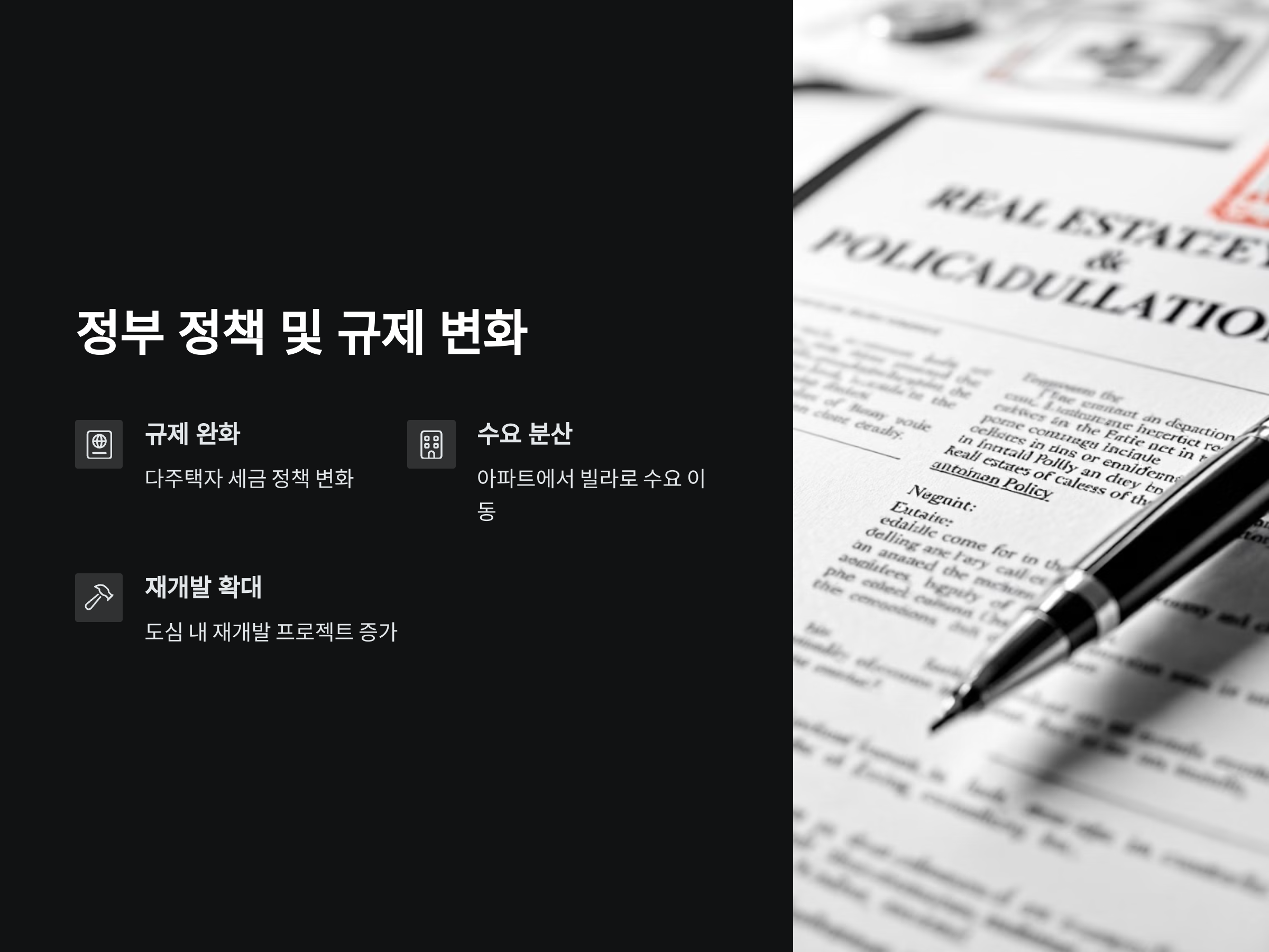 빌라 시세의 주요 상승 요인 중 하나는 정부의 부동산 정책 변화입니다. 정부는 주택 공급을 확대하기 위해 다양한 규제를 시행하고 있으며, 이는 시장에 큰 영향을 미치고 있습니다. 특히, 정부의 규제 완화와 다주택자에 대한 세금 정책 변화가 빌라 시장에 긍정적인 영향을 미쳤습니다. 세금 부담이 줄어들고 규제가 완화되면서, 그동안 아파트 위주로 집중됐던 수요가 빌라로 분산되고 있는 현상이 나타나고 있습니다.