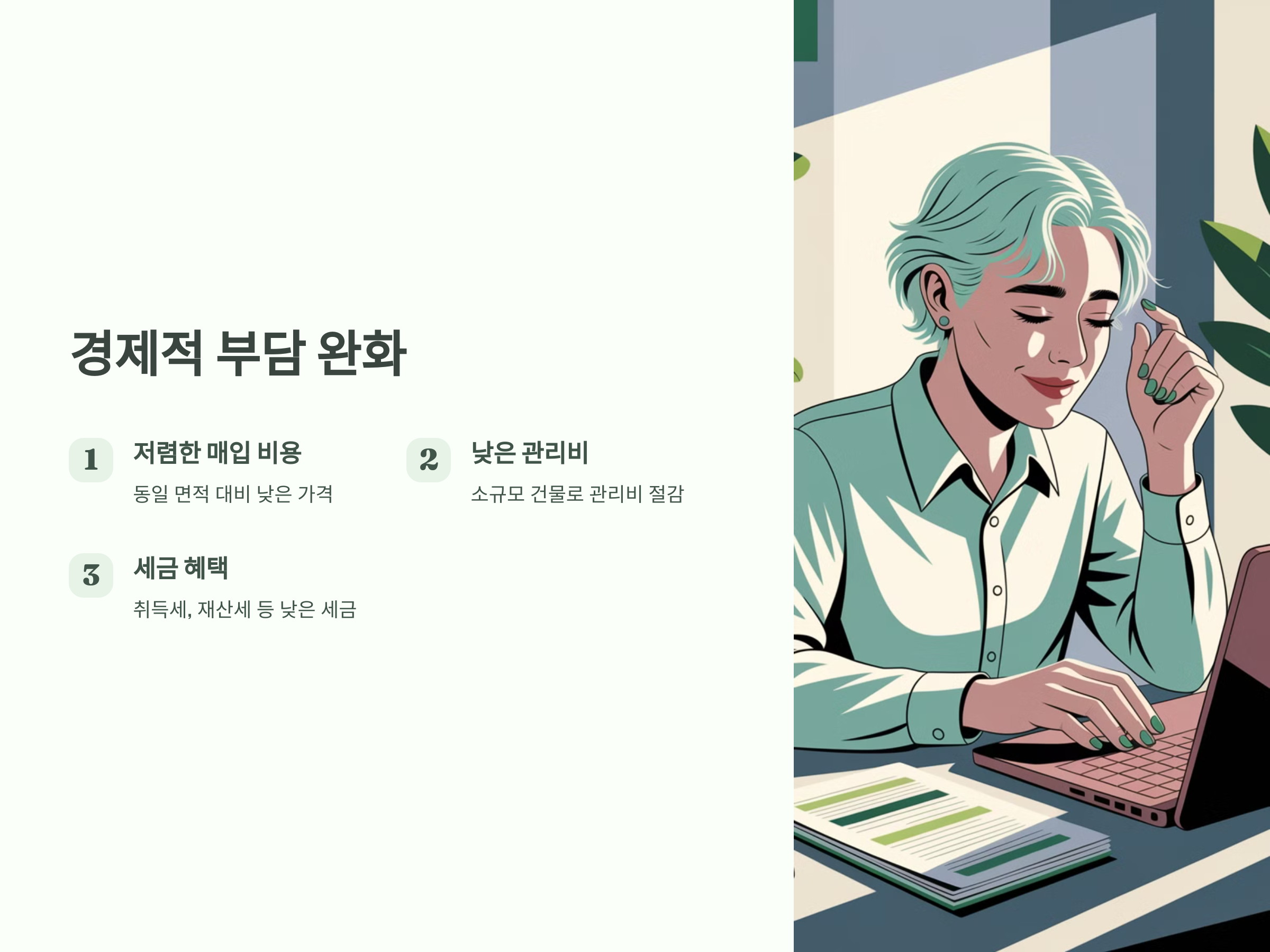 빌라는 아파트에 비해 취득세, 재산세 등 부동산 관련 세금이 낮아 초기 부담이 적습니다. 또한, 대출 시 아파트보다 규제가 덜하여 자금 마련에 유리한 측면이 있습니다. 이는 경제적인 이유로 주거지를 선택하는 분들에게 큰 이점이 됩니다. citeturn0search1