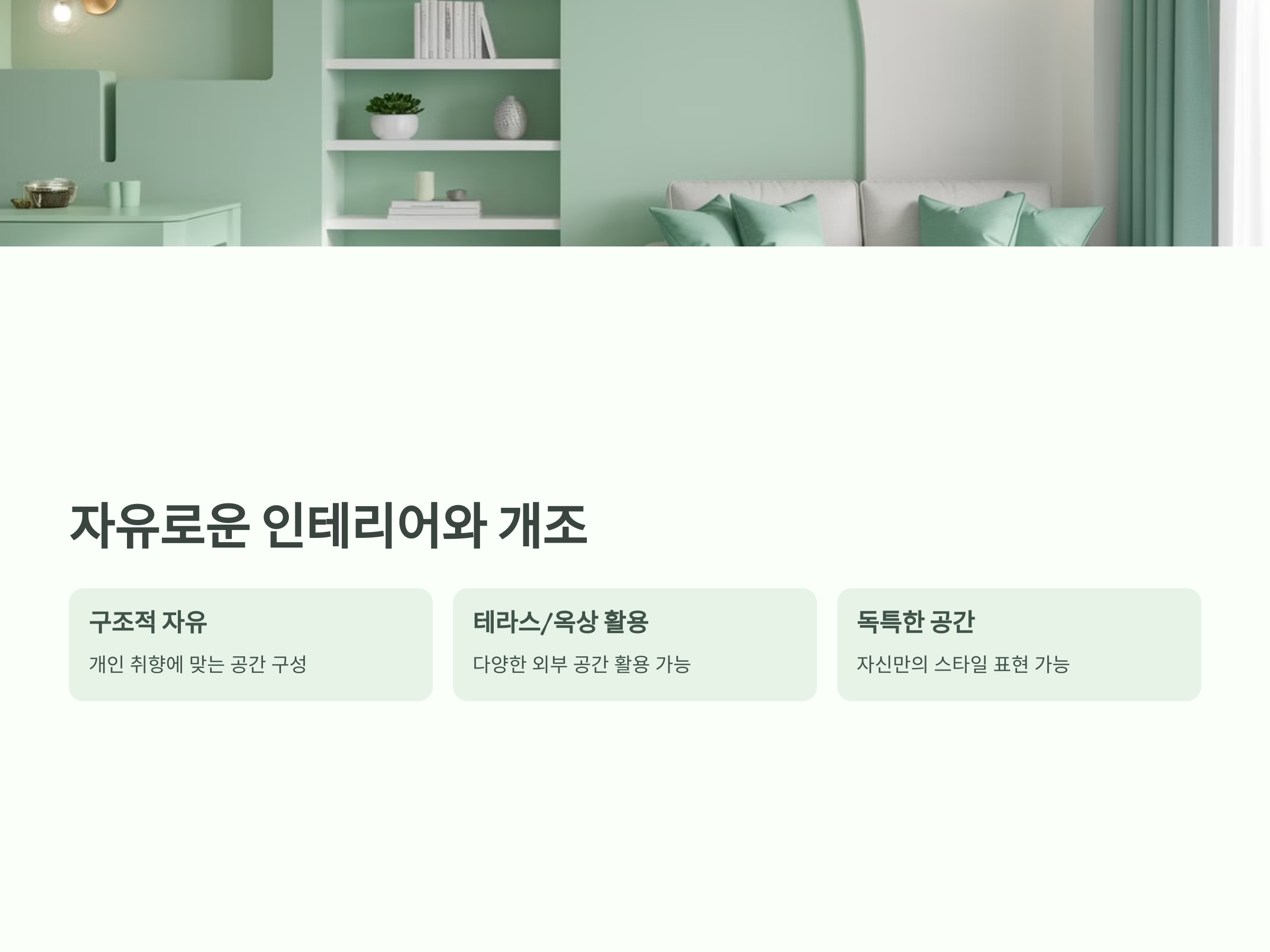빌라는 구조적 제약이 비교적 적어 개인의 취향에 맞게 인테리어나 공간 개조가 용이합니다. 이는 자신만의 독특한 공간을 만들고자 하는 분들에게 큰 매력으로 다가옵니다. 또한, 일부 빌라는 테라스나 옥상을 활용할 수 있어 다양한 공간 활용이 가능합니다. citeturn0search3