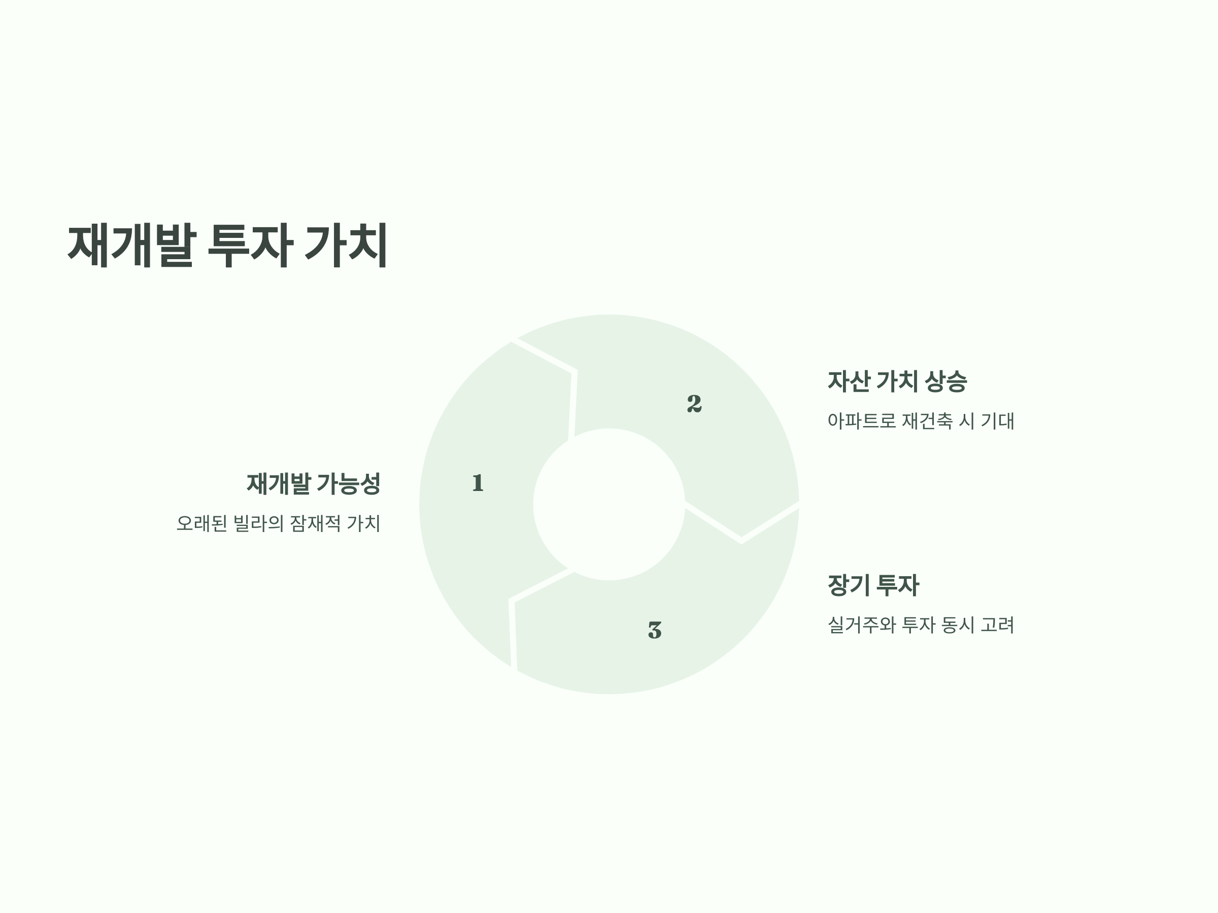 오래된 빌라의 경우 재개발 가능성이 있어 장기적인 투자 가치가 높을 수 있습니다. 특히, 재개발 예정 지역에 위치한 빌라는 향후 아파트로 재건축되어 자산 가치 상승을 기대할 수 있습니다. 이는 실거주와 투자를 동시에 고려하는 분들에게 매력적인 요소입니다. citeturn0search4