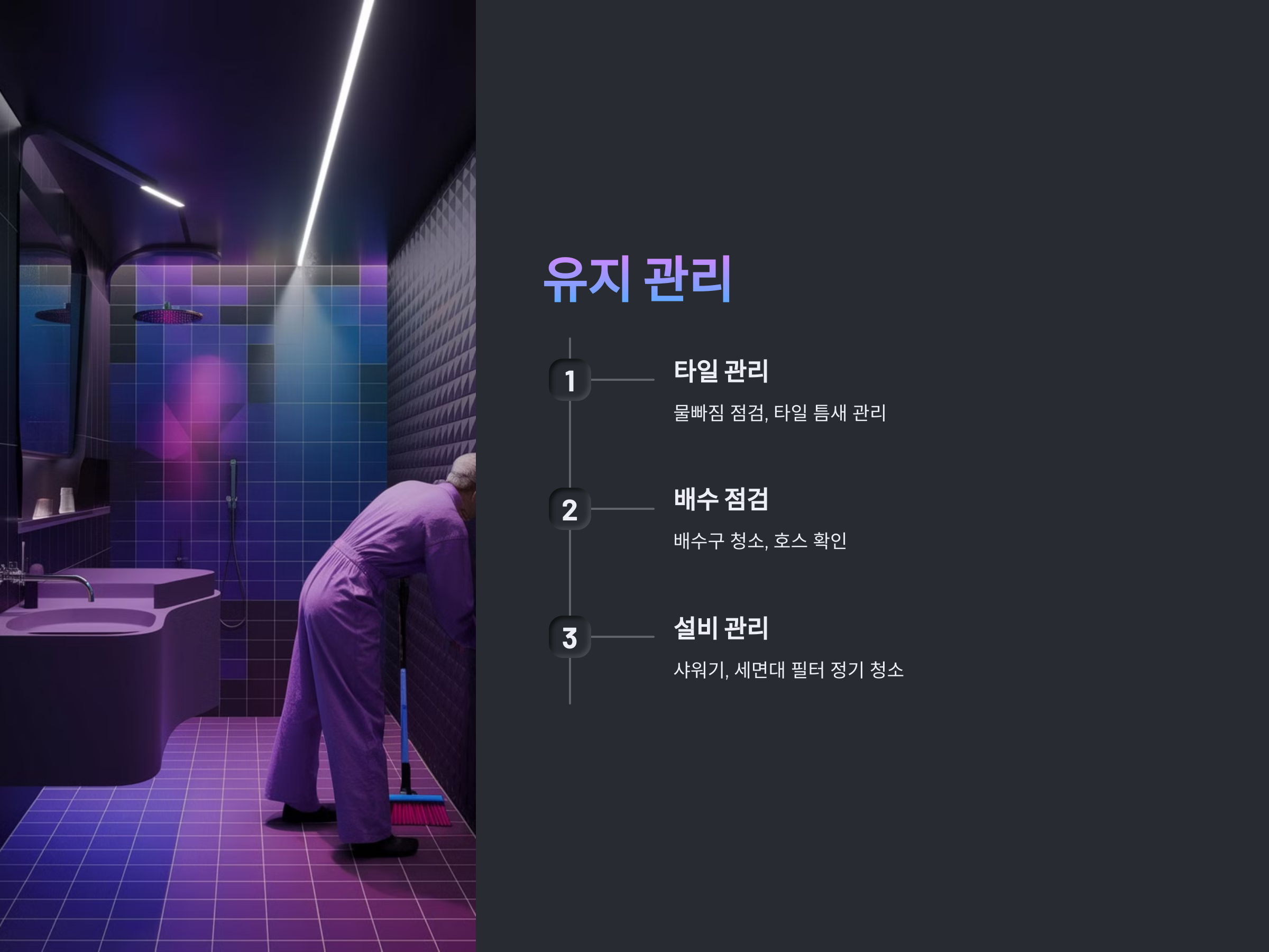 리모델링이 끝난 후에는 욕실을 잘 관리하고 유지하는 것이 중요합니다. 특히 욕실은 습도가 높고, 물이 자주 닿는 공간이기 때문에 청결을 유지하는 것이 필수적입니다.