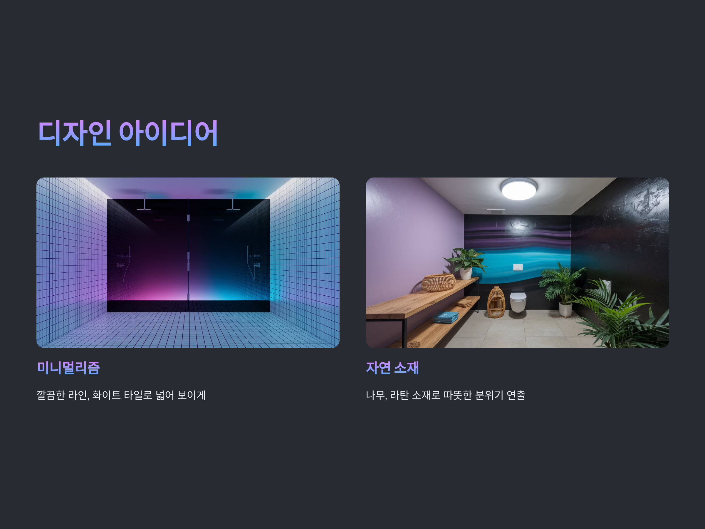 자연을 테마로 한 디자인도 요즘 트렌드입니다. 나무 느낌의 타일이나 라탄 소재의 욕실 소품을 활용하여 자연 친화적인 분위기를 연출할 수 있습니다. 특히, 나무 질감의 타일은 따뜻한 느낌을 주며, 좁은 공간에서도 편안하고 여유로운 느낌을 제공합니다.