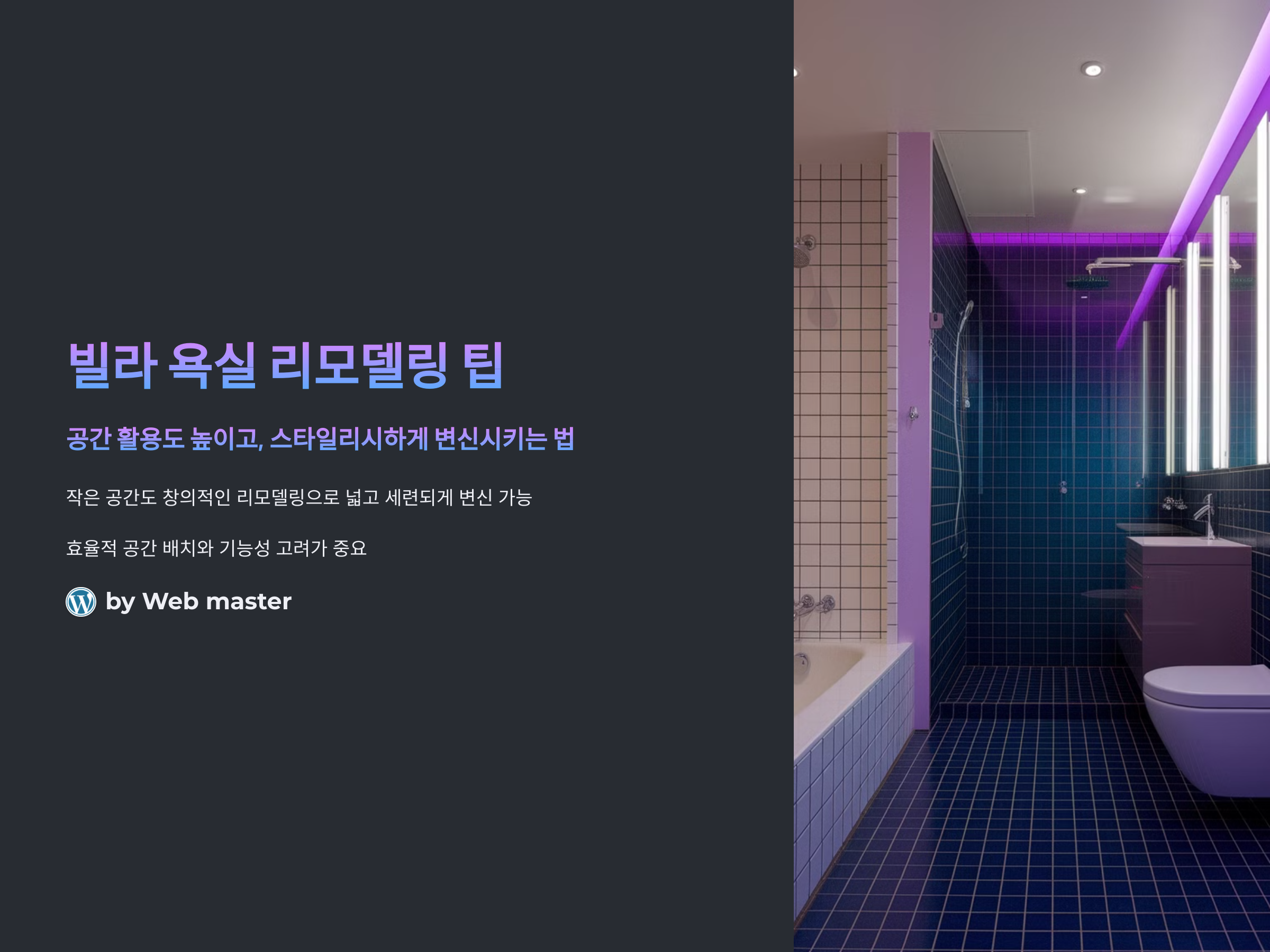 빌라 욕실 리모델링은 단순한 공간 변화를 넘어, 기능적이고 세련된 공간으로 변신할 수 있는 좋은 기회입니다. 예산과 시간을 효율적으로 계획하고, 필요한 자재와 가구를 잘 선택하면, 좁고 낡은 욕실도 훌륭한 공간으로 변신할 수 있습니다. 다양한 디자인 아이디어와 기능적인 요소를 고려하여, 자신만의 스타일을 반영한 욕실을 만들어 보세요.