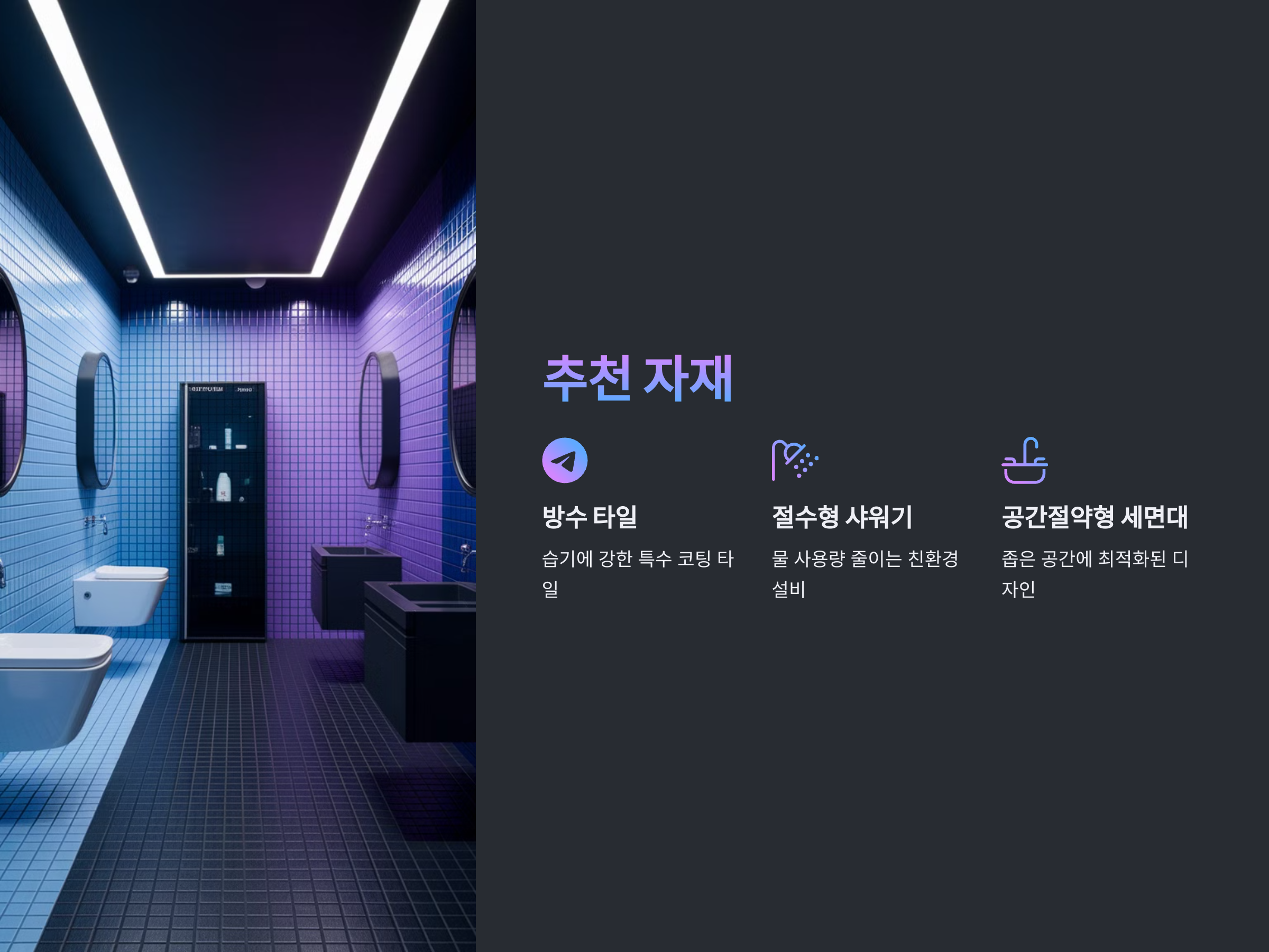 좁은 욕실에서는 샤워 공간을 효율적으로 배치하는 것이 중요합니다. 샤워 부스를 유리로 설치하거나, 벽면에 수납 공간을 마련하여 공간을 효율적으로 활용할 수 있습니다. 또한, 비대칭적인 디자인을 통해 공간을 더 넓게 보이도록 할 수 있습니다.