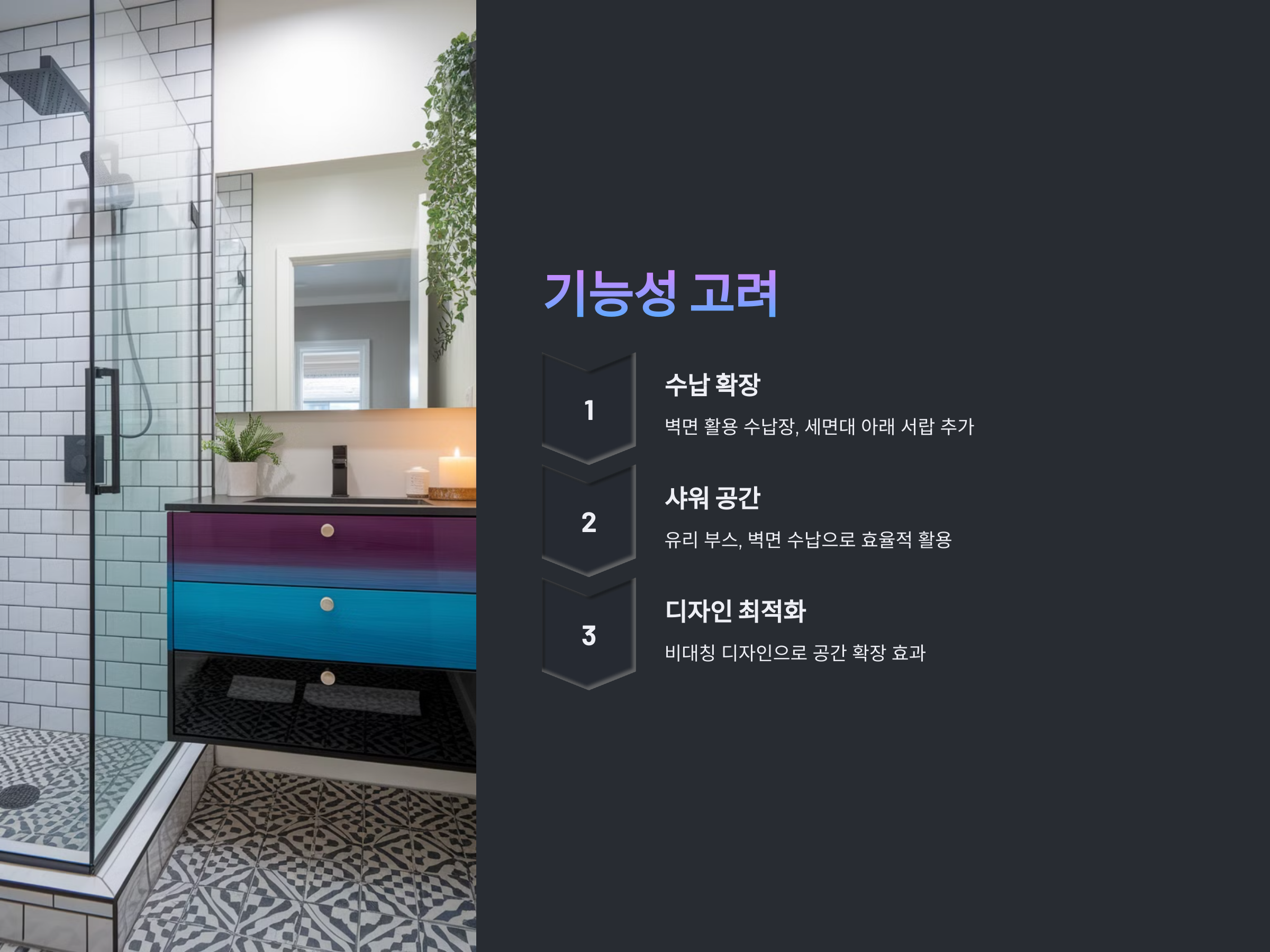 디자인뿐만 아니라 욕실의 기능성도 매우 중요합니다. 특히 빌라 욕실은 대부분 공간이 좁기 때문에, 효율적인 배치와 기능성 있는 가구를 선택하는 것이 필수적입니다.