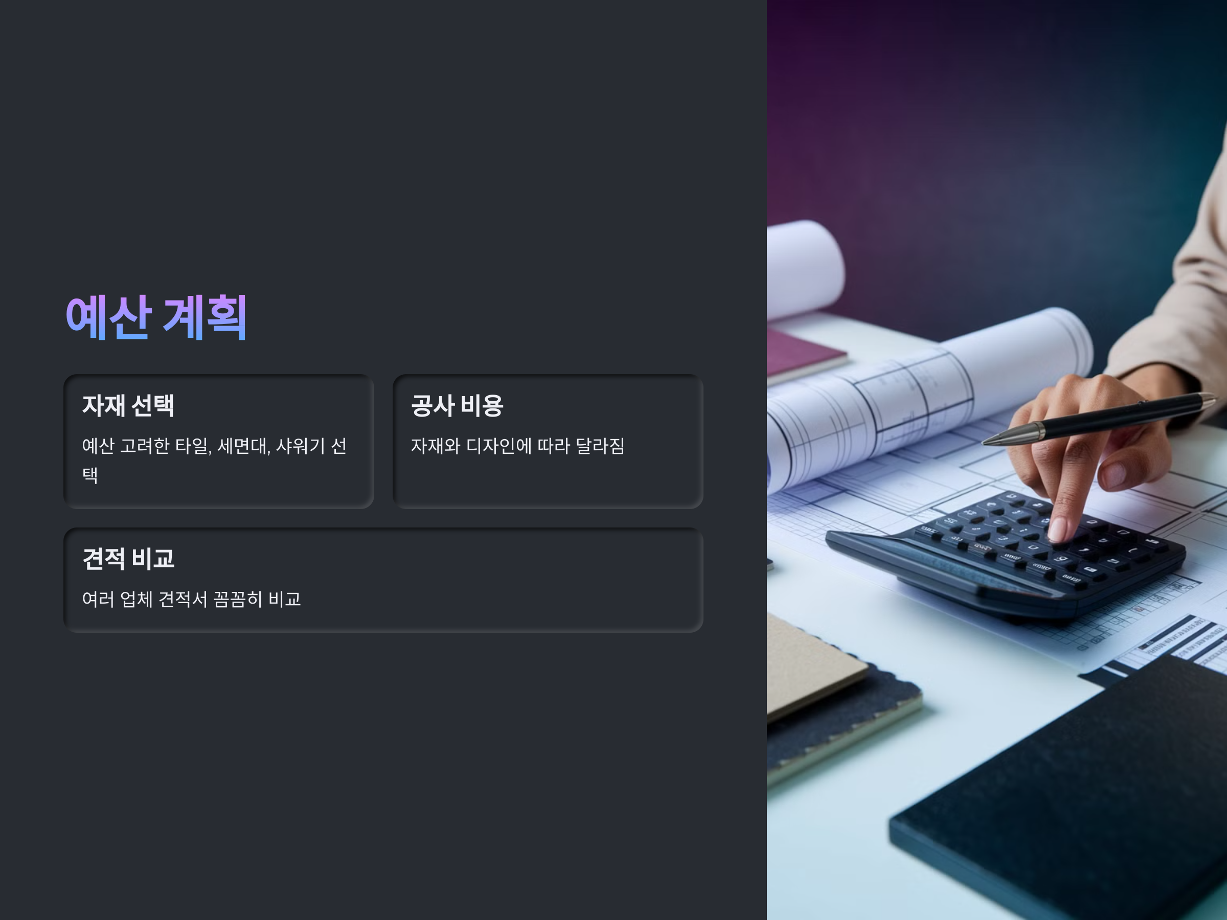 예산을 어떻게 계획하느냐에 따라 리모델링의 퀄리티가 달라집니다. 많은 사람들이 리모델링 예산을 과소평가하는 경향이 있는데, 필요한 자재와 시공에 드는 비용을 미리 계산하는 것이 중요합니다.