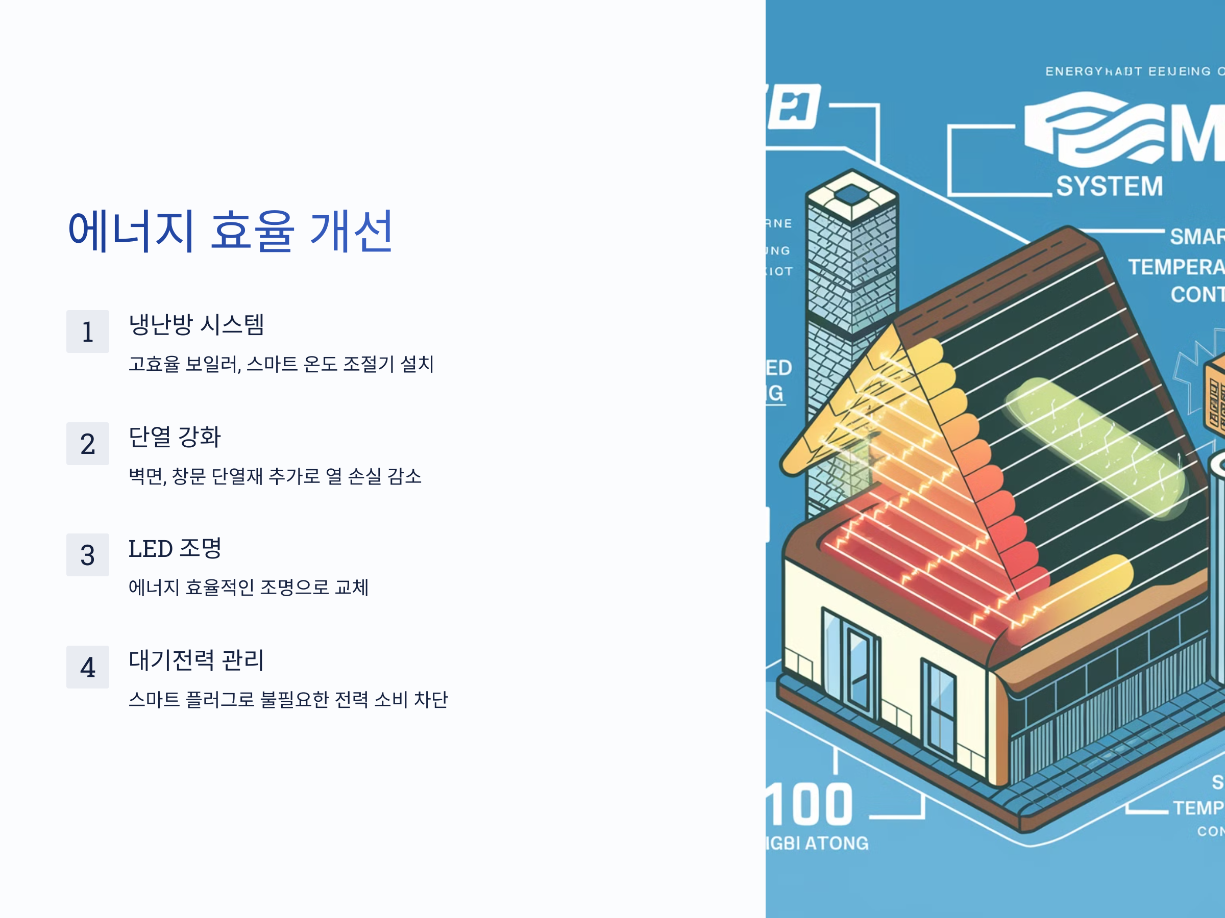 에너지 효율이 높은 난방 및 냉방 시스템을 설치하는 것만으로도 유지비 절감에 큰 도움이 됩니다. 예를 들어, 고효율 보일러나 스마트 온도 조절기를 설치하면 난방비를 절감할 수 있습니다. 또한, 벽면이나 창문에 단열재를 추가하여 열 손실을 줄이는 것도 매우 효과적입니다. 이 방법은 초기 비용이 들지만, 장기적으로 보면 큰 비용 절감 효과를 가져옵니다.