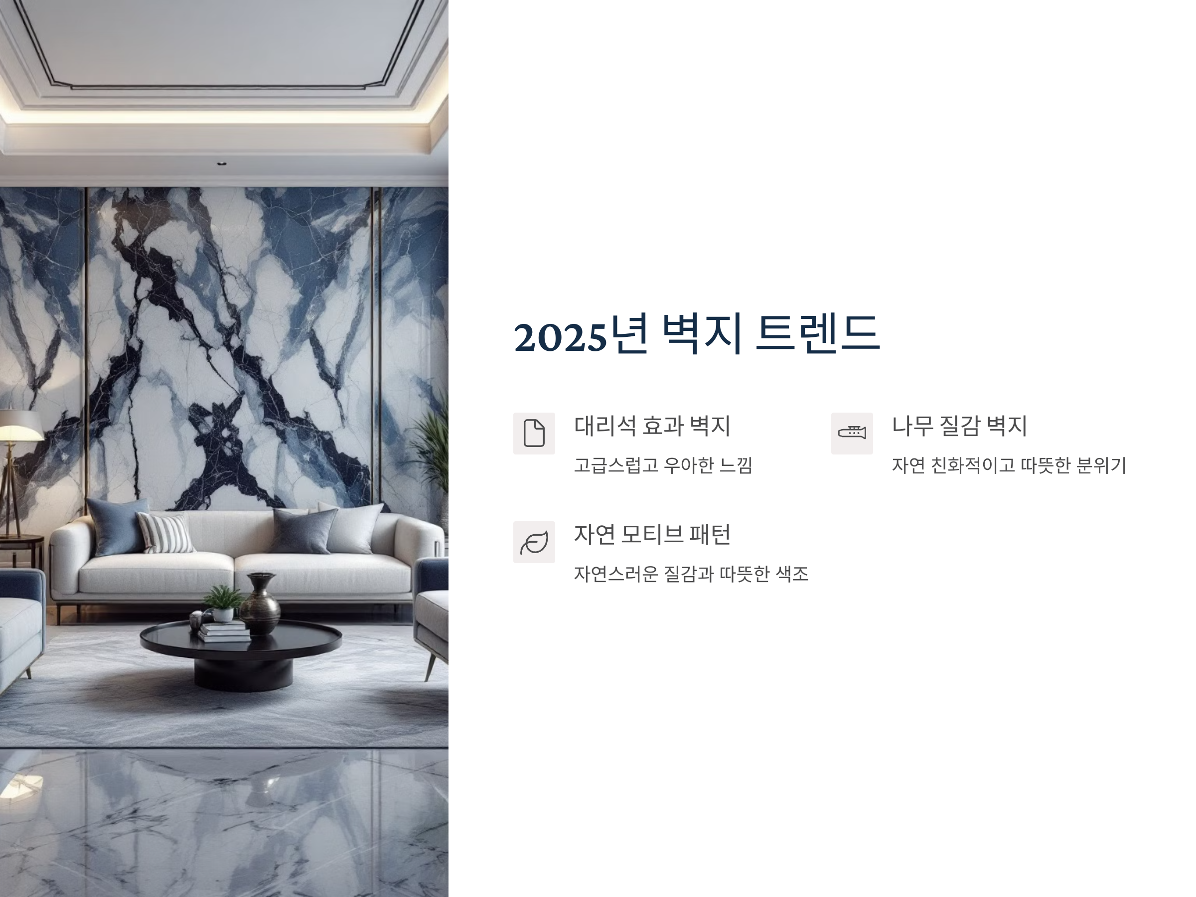 최근에는 대리석 효과 벽지, 나무 질감 벽지, 그리고 자연을 모티브로 한 패턴 벽지가 인기를 끌고 있습니다. 대리석 벽지는 고급스러움과 우아함을 강조하며, 자연 나무 질감 벽지는 자연 친화적이고 따뜻한 느낌을 줍니다. 특히 빌라의 거실이나 주방, 침실 등에서 이러한 벽지 스타일은 더욱 빛을 발합니다.