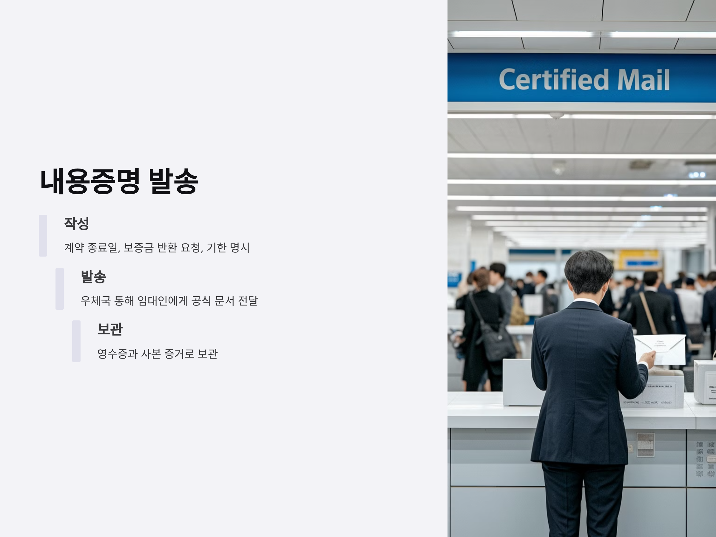 - 작성 요령: 내용증명에는 계약 종료일, 보증금 반환 요청 내용, 반환 기한 등을 명시해야 합니다. 발송 후에는 우체국에서 받은 영수증과 사본을 잘 보관해야 합니다.