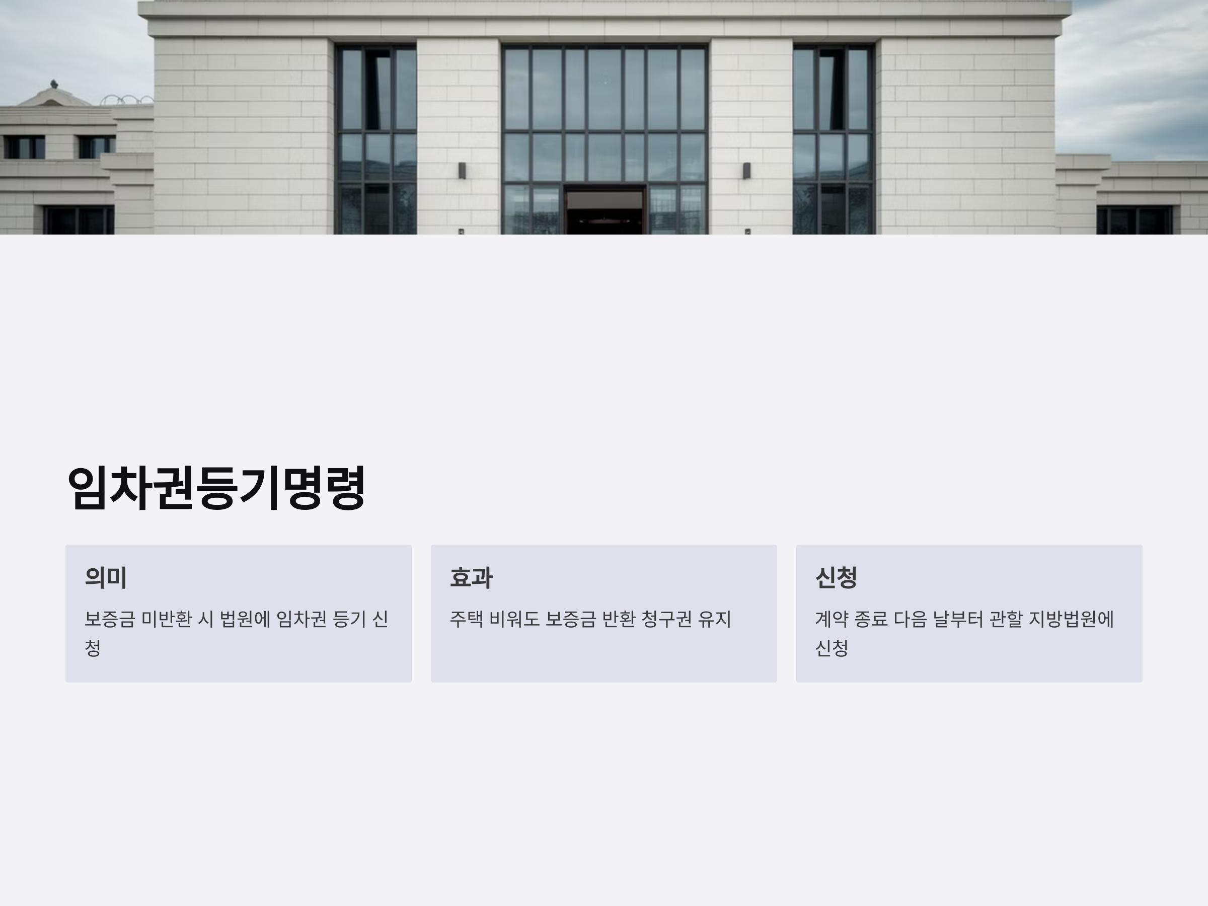- 임차권등기명령이란: 임대차 계약이 종료된 후에도 보증금을 반환받지 못한 임차인이 법원에 신청하여 주택 등기부등본에 임차권을 등기하는 제도입니다. 이를 통해 임차인은 주택을 비우더라도 보증금 반환 청구권을 유지할 수 있습니다.