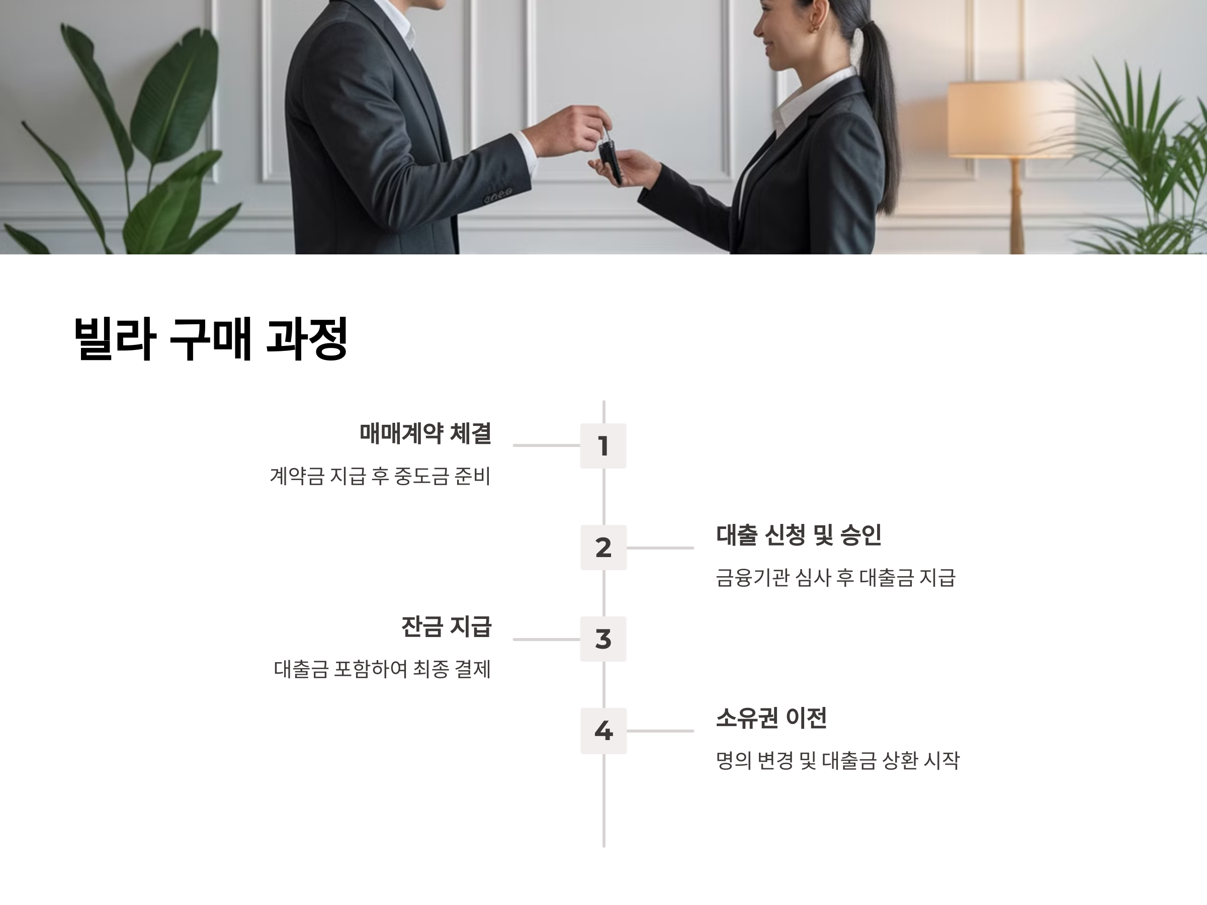 빌라를 구매하려면 우선 매매계약을 체결해야 합니다. 매매계약을 체결한 후, 계약금과 중도금을 지급하게 되며, 이때 중도금대출이 필요하게 됩니다.
