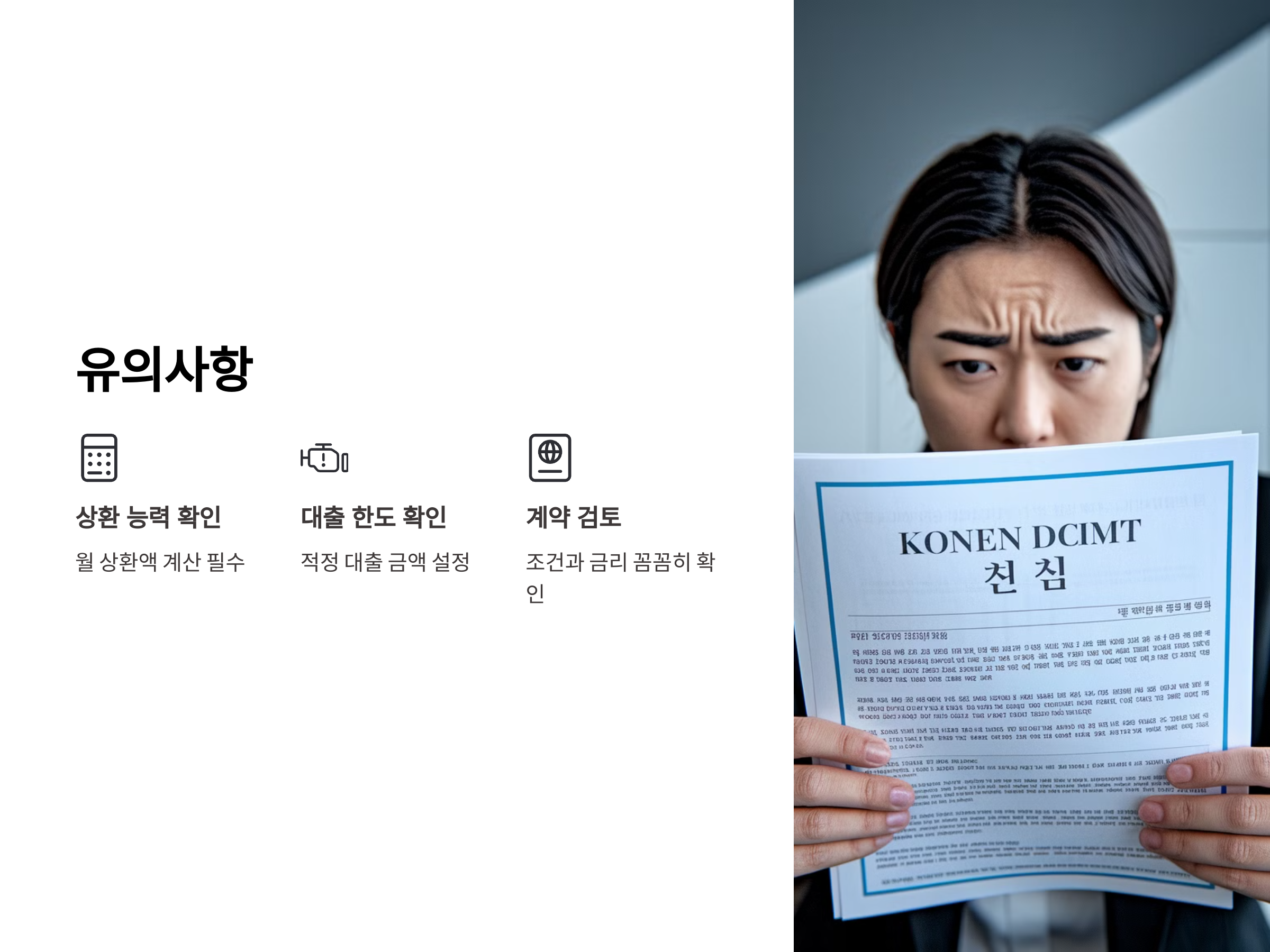 빌라 중도금대출은 장점이 많지만, 몇 가지 유의사항도 있습니다. 이를 반드시 체크하고 대출을 신청하는 것이 중요합니다.