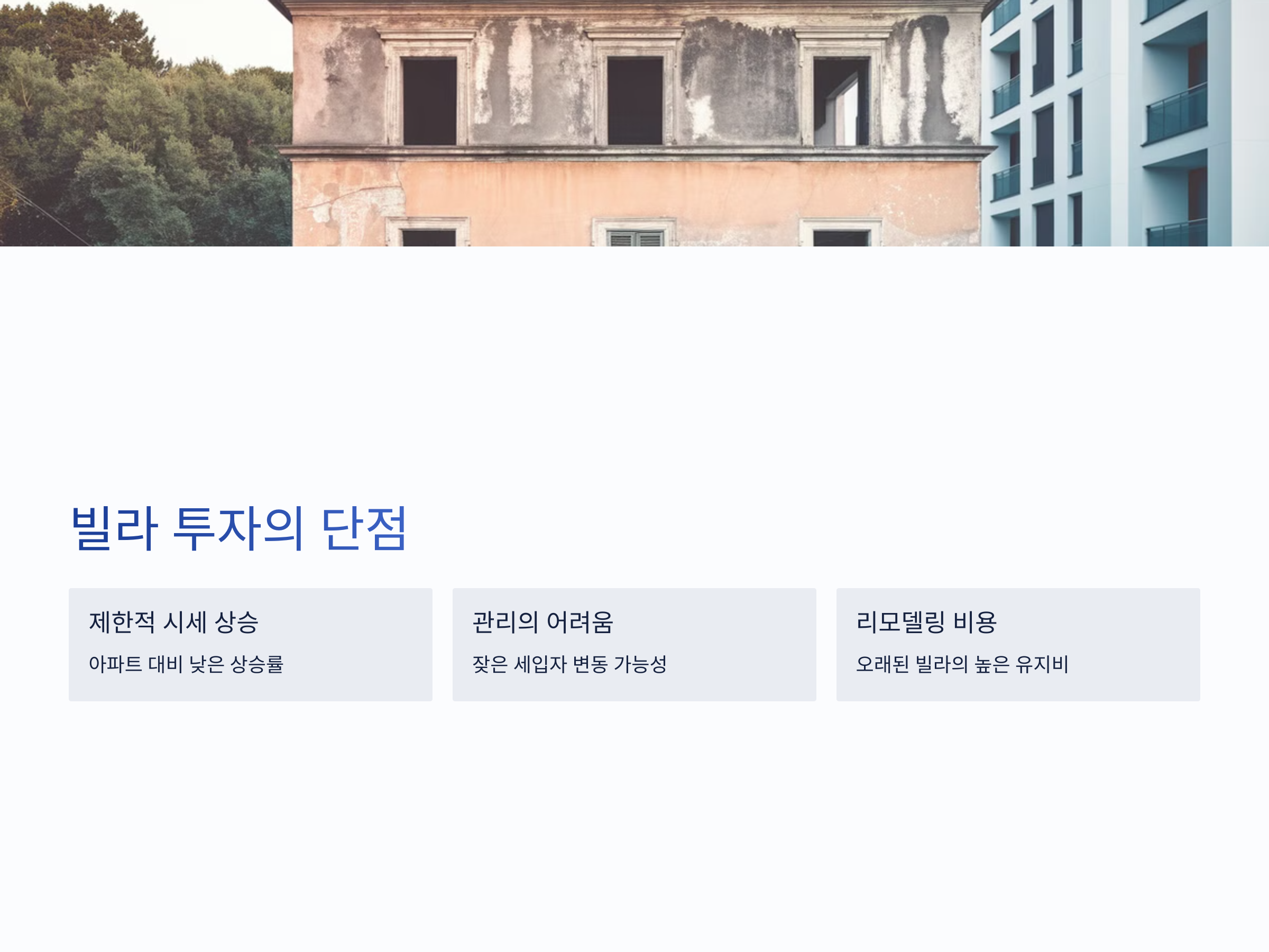 하지만 빌라에는 몇 가지 단점도 존재합니다. 첫 번째는 상대적으로 시세 상승이 적다는 점입니다. 아파트와 달리 빌라는 시세 상승률이 낮거나 한정적일 수 있기 때문에 장기적인 자산 가치를 기대하기 어려운 경우가 많습니다. 특히 오래된 빌라일 경우 리모델링 비용이 크고, 재건축이 어려운 경우가 많아 자산 가치 상승이 제한적입니다.