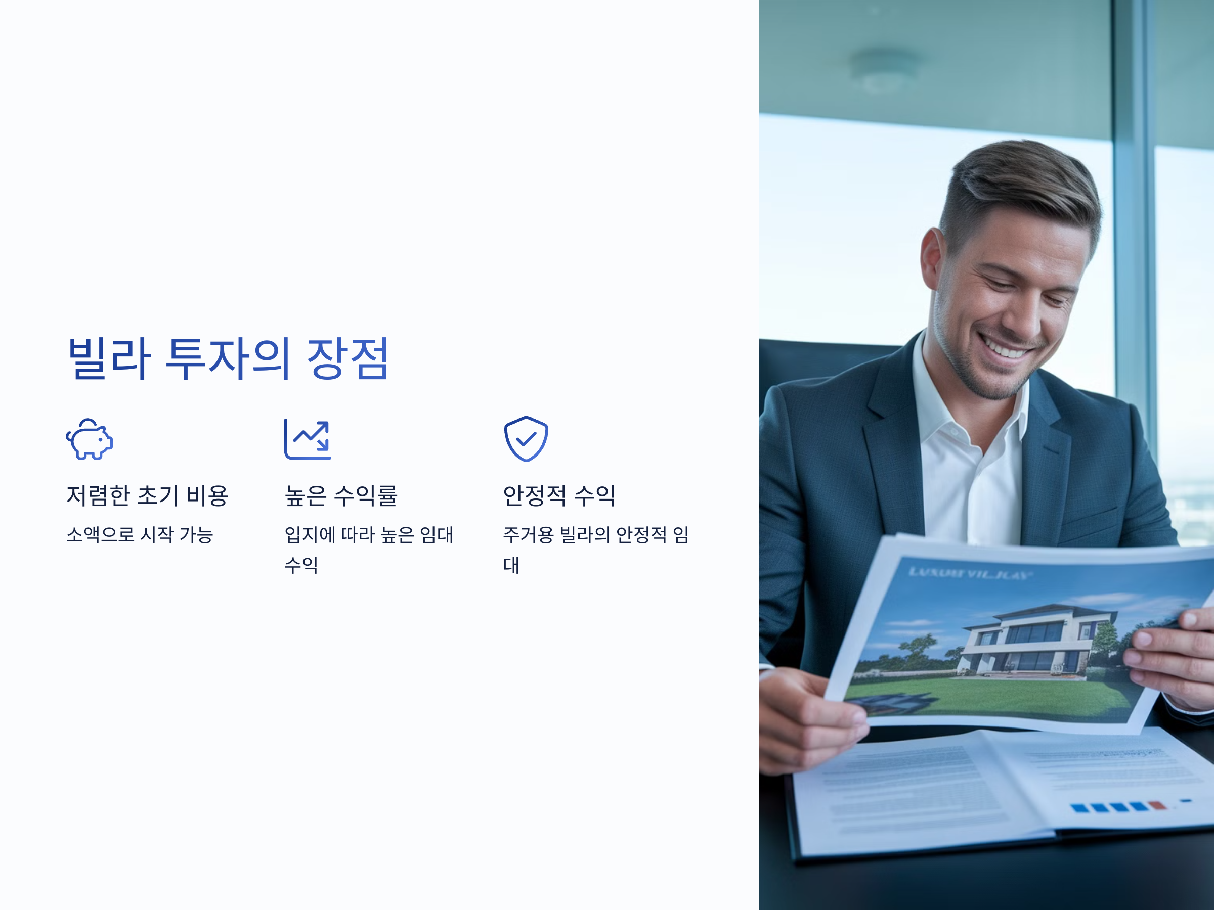 빌라를 수익형 부동산으로 고려할 때의 가장 큰 장점은 무엇보다 상대적인 낮은 초기 투자비용입니다. 아파트에 비해 저렴한 가격으로 투자할 수 있어, 소액으로도 시작할 수 있는 기회를 제공합니다. 또한, 입지에 따라 임대 수익률이 상당히 높을 수 있다는 점이 매력적입니다. 특히, 주거용으로 이용되는 빌라는 안정적인 수익을 낼 가능성이 큽니다.
